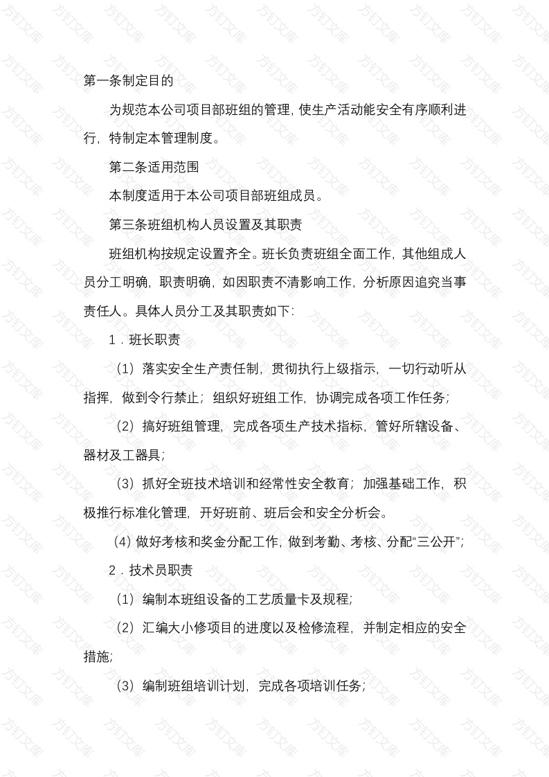 条制定目的为规范本公司项目部班组的管理,使生产活动能安全有序顺利进特制定本管理制度。第二条适用范围本制度适用于本公司项目部班组成员第三条班组机构人员设置及其职责班组机构按规定设置齐全。班长负责班组全面工作,其他组成人员分工明确,职责明确,如因职责不清影响工作,分析原因追究当事责任人。具体人员分工及其职责如下:1.班长职责(1)落实安全生产责任制,贯彻执行上级指示,切行动听从指挥,做到令行禁止;组织好班组工作,协调完成各项工作任务2)搞好班组管理,完成各项生产技术指标,管好所辖设备器材及工器具;(3)抓好全班技术培训和经常性安全教育;加强基础工作,积极推行标准化管理,开好班前、班后会和安全分析会。(4)做好考核和奖金分配工作,做到考勤、考核、分配“三公开”:2.技术员职责(1)编制本班组设备的工艺质量卡及规程汇编大小修项目的进度以及检修流程,并制定相应的安全措施3)编制班组培训计划,完成各项培训任务4)组织班组成员学习所辖设备的技术规范、熟悉设备情况及规程制度等。3安全员职责(1)负责本班组的安全台账记录(2)监督、制止现场作业中的违章行为;(3)按时进行安全周活动;万文对现场作业环境中出现的不安全问题,准确汇报班长;宣传员职责1)真实、及时宣传本班组的先进事迹,以及工作成绩、活动负责班内人员的政治学习,以及了解新形势,开拓思想3)积极、主动向宣传部供稿,每月不少于x篇。材料员职责1)做好本班的工器具、材料的领用发放,不准私自挪借、支出工器具及材料,对库中的材料、工器具定要妥善保管好3)及时了解掌握现场所需材料、工器具以及本班组的库存数随时保证现场检修所需材料的供应文1负责本班人员的考勤登记2)协助班长登记班内成员的病事假、加班等3负责工资、奖金的领取发放;工资、奖金表一定要详细正确无误。万第四条具体管理制度万劳动纪律管理X严格执行工艺纪律,文明生产、文明施工,如因违反操作规程或野蛮作业面而造成的一切责任由当事人负全责。2,上班时间不得溜班、窜岗,不得在施工场地追逐打闹,不得在上班途中无故滞留宿舍。3保质保量完成当天的下达任务,不能完成任务的扣除天考勤。4.施工人员不得酗酒打架,发现一次除在项目部工程例会上通报外,扣除本月基本工资。安全生产管理安全教育制度(1)工人上岗前必须通过公司、项目部、班组的三级安全教育班组应针对本工种的安全操作规程和机械性能及安全劳动保护用品的使用等进行学习了解,然后由分公司统一试卷进行考试,合格后方准上班施工。(2)上班前安全教育:班组长应针对当班的重要工作内容,结合作业环境,气候条件对本班职工交待操作中各个环节应注意事项与特殊工种的配合等。3)上班前安全检查:每天上班前班组长或安全员检查每个职工的劳动防护情况,每个岗位周围的作业环境是否无患,各类安全技