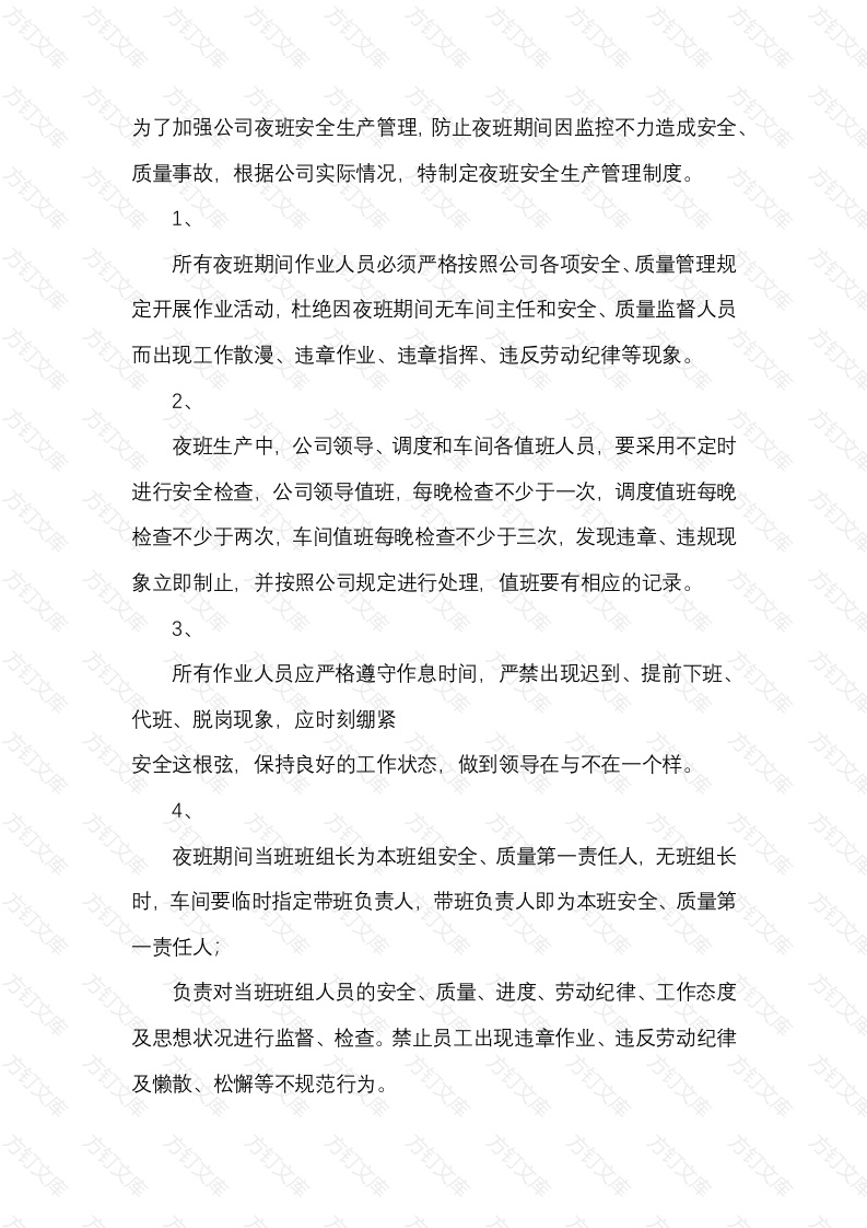 为了加强公司夜班安全生产管理,防止夜班期间因监控不力造成安全质量事故,根据公司实际情况,特制定夜班安全生产管理制度所有夜班期间作业人员必须严格按照公司各项安全、质量管理规定开展作业活动,杜绝因夜班期间无车间主任和安全、质量监督人员而出现工作散漫、违章作业、违章指挥、违反劳动纪律等现象。夜班生产中,公司领导、调度和车间各值班人员,要采用不定时进行安全检查,公司领导值班,每晚检查不少于一次,调度值班每晚检查不少于两次,车间值班每晚检查不少于三次,发现违章、违规现象立即制止,并按照公司规定进行处理,值班要有相应的记录3所有作业人员应严格遵守作息时间,严禁出现迟到、提前下班、代班、脱岗现象,应时刻绷紧安全这根弦,保持良好的工作状态,做到领导在与不在一个样文夜班期间当班班组长为本班组安全、质量第一责任人,无班组长时,车间要临时指定带班负责人,带班负责人即为本班安全、质量第负责对当班班组人员的安全、质量、进度、劳动纪律、工作态度及思想状况进行监督、检查。禁止员工出现违章作业、违反劳动纪律及懒散、松懈等不规范行为。夜班生产应和白班一样,坚持班前会制度,车间值班人员或班组长(带班负责人)班前应对当班上岗人员进行安全教育,安排工作的同时,有针对性的对员工进行安全提示和安全技术交底,对作业现场的设备、电气、工具、环境进行安全检查和安全确认,并留有记录。6夜班期间,班组长(带班负责人)应实行生产过程的全过程监控,做好生产现场的监督管理工作。对于夜班期间出现的工序流转,应严格执行自检、互检制度,进行交接确认签字,严禁不交接私自把不合格产品流入下道工序,对当班出现安全违章、违规和违纪现象进行制止并做好记录,并于次日上报车间。7、夜班生产中,原则上不进行装卸车、大构件翻转,因工期要求或特殊情况下需进行装卸车、大构件翻转时,车间必须有相应的安全技术措施保障,车间必须安排具有责任心强,经验丰富的管理人员或班组长在现场进行安全监督。8、夜间生产、包括装卸车必须有足够的照明,若区域内照明不足时,必须安装临时照明灯,确保现场光线充足9车间安排夜班生产人员时,在同一工作区域内必须有2人以上作业人员尽可能安排在同一住宅小区或居住较近人员同路上下班。夜班作业人员,未经车间班组长(带班负责人)或车间值班人员不允许擅自离开工作岗位,如遇特殊情况时,必须经车间值班人员同意,并签发出门证方可离岗。11夜班员工必须严格遵照设备安全技术操作规程操作本岗位的生产设备,不得使用、操作其它非职岗位的机械设备,如需要时,必须经车间值班人员同意后方可使用。12夜班人员不得挪用其它岗位的设备设施和工具,借用的工具必须在下班前归还并做好交接工作。13夜班生产中,员工发现异常情况及危机人身、设备安全情况时必须立即停产,迅速向车间值班领导、调度值班汇报,必要时及时向公司总值班汇报。14各值班人员检查时若发现有违反安全、质量、劳动纪律等方面的违纪行为除对当事人按公司规定双倍处罚外,同时将对车间主任、班组长(带班负责人)及公司包保领导给予处罚。15公司各值班人员包括班组负责人,必须严格执行公司各项规定严格管理,做到有错必究、违章必处,确保公司夜班的安全生产