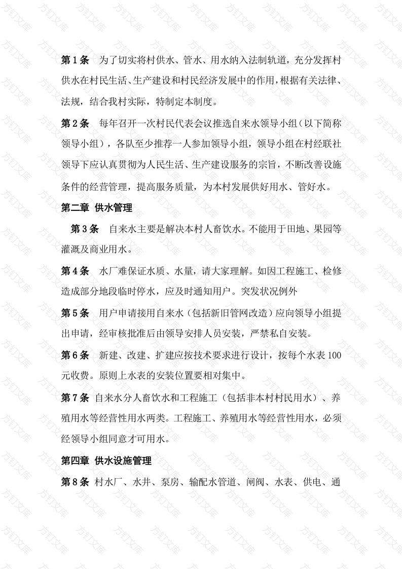 第1条为了切实将村供水、管水、用水纳入法制轨道,充分发挥村供水在村民生活、生产建设和村民经济发展中的作用,根据有关法律、法规,结合我村实际,特制定本制度。第2条每年召开一次村民代表会议推选自来水领导小组(以下简称领导小组),各队至少推荐一人参加领导小组,领导小组在村经联社领导下应认真贯彻为人民生活、生产建设服务的宗旨,不断改善设施条件的经营管理,提高服务质量,为本村发展供好用水、管好水。第二章供水管理第3条自来水主要是解决本村人畜饮水。不能用于田地、果园等灌溉及商业用水。第4条水厂难保证水质、水量,请大家理解。如因工程施工、检修造成部分地段临时停水,应及时通知用户。突发状况例外第5条用户申请接用自来水(包括新旧管网改造)应向领导小组提出申请,经审核批准后由领导安排人员安装,严禁私自安装。第6条新建、改建、扩建应按技术要求进行设计,按每个水表100元收费。原则上水表的安装位置要相对集中。第7条自来水分人畜饮水和工程施工(包括非本村村民用水)、养殖用水等经营性用水两类。工程施工、养殖用水等经营性用水,必须经领导小组同意才可用水。第四章供水设施管理第8条村水厂、水井、泵房、输配水管道、闸阀、水表、供电、通讯线路及专用道路、公共水站等设施,属村集体财产,受法律保护村里改建或加装水厂设备需要用到土地的,村民应无偿提供。第9条供水管道及其附属建筑设施周围,严禁挖抗取土、堆放垃圾和其它材料。第10条用户需要移动或改造供水设施时,必须报领导小组审查办理、改装。由此产生的费用由用户负担。第11条村民有维护村公共供水设施的义务,发现村公共供水设施损坏、漏水的,应及时报告村经联社。村经联社接到报告后应立即实施检查、抢修。第12条◆凡用户投资和村民委敷设的户外水管,表前部分均由村经联社管理维修,表后由用户负责管理维修,用户不得私自移改或拆除。在不影响用户用水的前提下,领导小组可进行改装或发展其它用户用水,他人不得干涉。第13条公共用水设备任何单位和个人不得启闭。水表由领导小组管理并加铅封锁定。第五章水表及水费管理第14条人畜饮水水费分段计费,基本水费每立方1.5元,若每人每月超过3立方的,超过部分每立方计2元:工程施工、养殖等经营性用水每立方计2元。另外,如果缺水期用到其它渠道商业水,应再把所需水费按各户用量平均分到各用水户。第15条每个水表由各户按实际人数核定,核定后每年为一个周期。第16条水表私自弄坏计量不准由用水户负责更换费100元。第17条水费收取由领导小组负责,用户须及时足额交纳。第18条用户每月25日必须到村办公室交纳水费,欢迎预交水费第19条逾期不交纳水费者,超期按一天一元加收滞纳金,逾期二个月滞纳金达60元时,拆表暂停供水,交清水费和滞纳金后方可恢复用水。第20条由于客观原因水表失灵,不能正确计量时,按上三月平均用量收费,并分清责任及时更换水表。第21条用户用水必须安装水表,无水表的用户,不能用水。除本村学校外任何单位和个人都无权免除用户水费。第22条收取的水费,统一监管,专户储存,专款专用。第六章计划用水第23条各用户都必须贯彻计划用水、节约用水的有关规定,努力提高节水意识,加强节水管理。第24条村民委要加强巡回检查,依据有关规定严肃处理各种浪费水的行为,坚决杜绝浪费水的现象发生。第七章违章处理第25条对违章用水者,应根据情节轻重,给予批评、通报、处以500元罚款、赔偿损失(直接或间接损失)、没收设备、暂停供水等处理,以至追究法律责任。罚、赔款列入供水专项资金。下列情况之一者,属违章用水:1、拖欠水费者。(除滞纳金外加罚款5元)2、绕越水表盗水、未经水表用水者。(罚款500元)3、未经批准私自接用水者。(罚款200元)4、采用不正常手段使水万