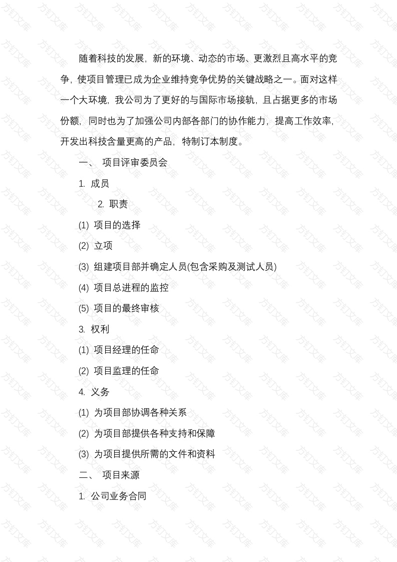 随着科技的发展,新的环境、动态的市场、更激烈且高水平的竞使项目管理已成为企业维持特竞争优势的关键战略之一。面对这样个大环境,我公司为了更好的与国际市场接轨,且占据更多的市场份额,同时也为了加强公司内部各部门的协作能力,提高工作效率开发出科技含量更高的产品,特制订本制度。项目评审委员会方成员2.职责(1)项目的选择(2)立项(3)组建项目部并确定人员(包含采购及测试人员)方订项目总进程的监控(5)项目的最终审核方3权利(1)项目经理的任命(2)项目监理的任命义务(1)为项目部协调各种关系(2)为项目部提供各种支持和保障3)为项目提供所需的文件和资料项目来源1公司业务合同万万2公司客户需求方方订方3市场需求项目经理万任期项目经理的任期从接管该项目任务起,到项目全部完成交付,并处理好各项遗留问题和接受项目评审委员会的评审完毕时止。任期期满后回原部门岗位。2.职责(1)在项目评审委员会的管理下,对所指定项目实行全面领导全权负责。对项目进行市场调研(需求性、可行性、发展性和经济性)提交该项目的可行性报告(④)完成公司相应项目的合同要求或内部产品研发立项要求(⑤)采用科学的管理方法,对项目的工期、质量、安全、成本全面组织、管理,并负全责。(6)贯彻按劳分配的原则,利用物质奖励和精神鼓励相结合的办调动项目内全体人员的积极性和创造性。保存项目过程中的相关文件和数据(8)组织编制项目文件、项目小结,并接受审核。万3.权利(1)项目的经营决策和设计指挥权。项目管理有对部门设置和人员编制建议权,在部门内部有对文员工作的分配和调整权(3)有权建立项目部内部的各种岗位经济责任制,在规定范围内有奖金分配的自主权及项目内员工的奖惩权。(4)接受项目评审委员会的任命,处理与项目有关的外部关系签订有关协议、合同。(⑤)有项目所需物资的采购权。4义务(1)根据项目需要,合理使用员工、资金、材料物资,并负责控制、指挥项目实施的全过程,处理内外关系,协调有关工作(2)加强经济核算,厉行节约,努力提高经济效益,并提供项目会计资料。积极配合项目监理的工作,确保项目按时或提前完成四项目监理1任期项目监理的任期从该项目正式立项起,到项目全部完成交付,并协同项目经理处理好各项遗留问题和接受项目评审委员会的评审完毕时止。任期期满后回原部门岗位。2.职责(1)根据项目合同的目标、业务需求和质量标准,对项目部提出的技术方案、项目管理活动以及系统设计、开发、集成和实施部署等活动进行全方位、全过程审核、监督和控制,以保证项目在预算范围内按时、按质完成,以保护公司的利益,降低项目的风险文
