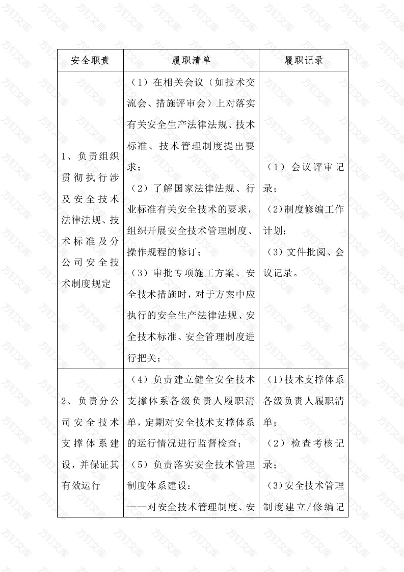 安全职责履职清单履职记录(1)在相关会议(如技术交文流会、措施评审会)上对落实订有关安全生产法律法规、技术标准、技术管理制度提出要1、负责组织(1)会议评审记贯彻执行涉(2)了解国家法律法规、行及安全技术业标准有关安全技术的要求,(2)制度修编工作法律法规、技组织开展安全技术管理制度、术标准及分操作规程的修订;(3)文件批阅、会公司安全技(3)审批专项施工方案、安议记录。术制度规定全技术措施时,对于方案中应执行的安全生产法律法规、安全技术标准、安全管理制度进(4)负责建立健全安全技术(1)技术支撑体系2、负责分公支撑体系各级负责人履职清各级负责人履职清司安全技术单,定期对安全技术支撑体系单支撑体系建的运行情况进行监督检查;(2)检查考核记设,并保证其(5)负责落实安全技术管理有效运行制度体系建设:(3)安全技术管理对安全技术管理制度、安制度建立/修编记文全技术规程、安全操作规程等方安全技术制度的编修工作进行安排,提出编修工作要求:督促指导主管部门按计方划开展安全技术管理制度、安方全技术规程、安全操作规程的制(修)订工作:(6)主持专题会议,组织技3、主持开展术、安全等相关部门,对制安全技术管(修)订的安全技术管理制理制度、安全度、安全技术规程、安全操作会议评审记录或者技术规程、安规程进行评审,形成评审意纪要。全操作规程发布实施前(7)定期对安全生产技术管的评审工作理制度运行情况进行评审,提出制(修)订意见:4、组织制定、(8)组织技术部门编制重大审批施工组方案措施的编制,提出安全技织设计、重大术要点;会议记录或纪要。安全技术方9)在重大方案措施完成编案(措施)及制后,组织技术、质量、安全环境保护措等相关部门进行评审,形成评文施方(10)承担施工总承包工作时,组织开展超过一定规模的危险性较大的分部分项工程方(或单项工程)安全专项方案需公司、分公司论证的工作,并督促检查方案的落实情况;5、组织开展安全生产“四新技术”的推(11)组织制定分公司“四新相关技术的应用、应用工作,技术”推广应用计划,并督促、安全技术论文、评对“四新技检查、评估计划实施情况奖、科研课题等。术”推广应用进行检查、指6、参加较大及以上生产安全事故的(12)按照“四不放过”的原内部调查分则,组织对生产安全事故技术会议记录或纪要。析、处理和鉴意见的落实;定,提出技术意见