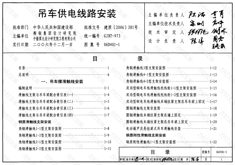 吊车供电线路安装主编单位负责人本怀主编单位技术负责人批准部门、中华人民共和国建设部批准文号建质〔2006)281号鞍朝集团设计研究院主编单位中船第九设计研究院工程有限公司统一编号GJBT-973实行日期二00六年十二月一日图集号06D401-1目录目录角钢滑触线3型支架安装图…1-12总说明…角钢滑触线41型支架安装图…1-13一、吊车裸滑触线安装角钢滑触线4-2型支架安装图……1-14编制说明…1-1双沟型铜电车线滑触线托线轮1-1型支架安装图…1-15滑触线支架与吊车梁配合索引表(一)双沟型铜电车线滑触线托线轮1-2型支架安装图……1-16滑触线支来与吊车梁配合索引表(二)双沟型铜电车线滑触线末端拉紧支架在吊车梁上固定…1-17滑触线支架与吊车梁配合索引表(三)…1-6滑触线支架与吊车梁配合索引表(四)…1-7圆翻滑触线末端拉紧支架在墙上固定…1-19钢质滑触线支架安装圆钢滑触线末端拉紧支架在吊车梁上固定1-20角朝滑触线1-1型支架安装图…1-8电动葫芦及悬挂粱式吊车滑触线安装·…1-21角钢滑触线1-2型支架安装图………1-9铜质刚性滑触线支架安装角朝滑触线2-1型支架安装图…1-10铜质刚性滑触线1-1型支架安装图…1-22角钢滑触线2-2型支架安装图目录图集号060401-1