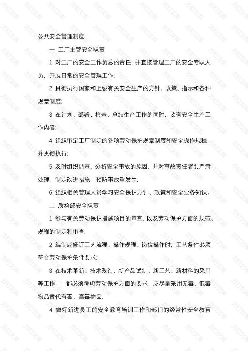 公共安全管理制度工厂主管安全职责1对工厂的安全工作负总的责任,并直接管理工厂的安全专职人开展日常的安全管理工作;2贯切执行国家和上级有关安全生产的方针、政策、指示和各种3在计划、部署、检查、总结生产工作的同时,要有安全生产]4组织审定工厂制定的各项劳动保护规章制度和安全操作规程5及时组织调查、分析安全事故的原因,并对事故责任者要严肃处理,制定改进措施,预防事故重发生6组织相关管理人员学习安全保护方针、政策和安全业务知识。质检部安全职责1参与有关劳动保护措施项目的审查,以及劳动保护方面的规范规程的制定和审查;2编制或修订工艺流程、操作规程、岗位操作时,工艺条件必须符合劳动保护条件要求;3在技术革新、技术改造、新产品试制、新工艺、新材料的采用等工作中,都必须考虑劳动保护方面的要求,应尽量采用无毒、低毒物品替代有毒、高毒物品:4做好新进员工的安全教育培训工作和部门的经常性安全教育文作三机电设备部门安全职责1负责工厂机械、电器、仪表、设备、工艺管道、通风排风装置的管理,使其经常处于完好状态;2制定或审定有关设备制造、改造方案,组织编制维修劳动保护措施计划、并确保其实施:3监督车间机械动力设备的正常使用,保证其正常运转,防止发4编制厂内通用设备的维修规程和有关操作制度,督促检查执行5负责厂内的设备及安全装置的管理、检查或定期检查6组织实施劳动保护措施计划和制定安全隐患的整改措施;7负责设备事故的调查分析,提出处理意见和改进措施做好新进员工的安全教育培训工作和部门的经常性安全教育四管理部门安全职责1负责劳动保护措施所需物资和防护器材的采购、供应,并确保采购的物料符合安全要求:2负责对采购、保管人员经常性安全教育,切实搞好仓库的防火安全工作:3认真贯彻执行国家颁布的危险物品安全管理规定,并督促落实。五后勤保卫部门安全职责在工厂主管领导下,负责全厂的保卫工作2认真贯彻执行上级有关防火工作的政策、法令、指示、规章制3负责厂内消防、有毒物品、爆炸物品、灼伤、触电等的急救措施及时准确的进行抢救、报警4负责厂内宿舍、饭堂管理工作,并进行监督、检查:文5负责厂区的防盗工作,确保24小时有人巡查值班六生产部门安全职责1在编制生产计划时要同时编制劳动保护措施计划,检查生产进度时要同时检查安全生产情况:2负责生产事故的调查分析,提出处理意见和改进措施3在生产中发现重大危险,要及时进行调度指挥。采取措施,消除隐患,并做出详细记录报告分送厂安全部门:4安排生产计划时,必须考虑生产设备装置的能力,防止设备装置带负荷运行;在安排生产的产量和品种时,负责做好必要的安全措施的平衡6做好新进员工的安全教育培训工作和部门的经常性安全教育工作七车间主管安全职责1保证国家和上级安全生产法规、制度在车间贯彻执行,把安全工作列入议事日程,做到“五同时”V