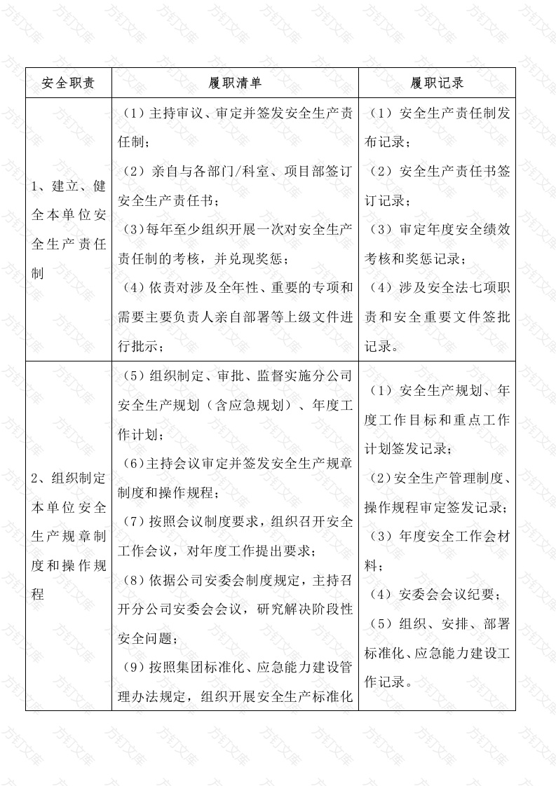 安全职责履职清单履职记录(1)主持审议、审定并签发安全生产责(1)安全生产责任制发(2)亲自与各部门/科室、项目部签订(2)安全生产责任书签1、建立、健安全生产责任书:订记录;全本单位安(3)每年至少组织开展一次对安全生产(3)审定年度安全绩效全生产责任责任制的考核,并兑现奖惩:考核和奖惩记录;制(4)依责对涉及全年性、重要的专项和(4)涉及安全法七项职万需要主要负责人亲自部署等上级文件进责和安全重要文件签批记录。(5)组织制定、审批、监督实施分公司(1)安全生产规划、年安全生产规划(含应急规划)、年度工度工作目标和重点工作计划签发记录;(6)主持会议审定并签发安全生产规章2、组织制定(2)安全生产管理制度、制度和操作规程;本单位安全操作规程审定签发记录;(7)按照会议制度要求,组织召开安全生产规章制(3)年度安全工作会材工作会议,对年度工作提出要求:度和操作规料(8)依据公司安委会制度规定,主持召程(4)安委会会议纪要:开分公司安委会会议,研究解决阶段性(5)组织、安排、部署安全问题:标准化、应急能力建设工(9)按照集团标准化、应急能力建设管作记录。理办法规定,组织开展安全生产标准化万方及应急能力建设工作;方方(10)审批签发年度教育培训计划(可编制专门的安全生产教育培训计划,也(1)教育培训计划签批可以把安全生产教育培训内容纳入企业3、组织制定员工教育培训计划);(2)对涉及教育培训所并实施本单(11)确保教育培训计划实施的人、财、需人、财、物相关文件/位安全生产物等资源,督促相关部门按计划开展培议题的研究和批示;教育和培训(3)参加培训的报名、计划(12)按要求参加法定(三类人员)上级单位(如企业领导人员安全轮训)(4)安全培训合格证件。组织开展的安全教育培训:(13)确保安全资源的有效配置,按公(1)安全管理机构设置、司分类管控要求,设置安全管理机构、部门职能和人员配备文4、保证本单配备安全管理人员;位安全生产(14)审批签发年度安全生产费用预算(2)安全生产费用预算投入的有效(或费用计划):实施(15)签批半年和年度安全生产费用投(3)安全生产费用报表:(4)对涉及安全费用相(16)督促财务部门定期对安全生产费关文件/议题的研究和批用使用统计情况进行核查;5)年度安全工作会材料。(17)签发年度隐患排查治理工作方案、安全检查考核工作计划:(18)每年至少应组织和参加一次综合安全检查,组织分析检查中发现的突出(1)年度隐患排查治理或系统性问题,确定整改措施,及时消工作方案、安全检查考核工作计划签发记录;5、督促、检(19)对于上级单位有特别要求的安全(2)带队开展安全检查查本单位的检查(如要求主要负责人带队或参与),报告签字记录和整改回安全生产工主要负责人要带队组织开展,对于检查复报告、照片、作,及时消中发现的重大隐患,要明确责任部门,(3)涉及研究综合、季除生产安全按“五定”原则落实整改;节性、专项等安全检查相事故隐患(20)督促各部门/科室、项目部组织开关会议纪要、文件批示;展综合、季节性、专项等安全检查,定(4)领导带/值班安排和期听取科技质量安全部安全检查工作汇过程记录。报,及时掌握、消除生产安全重大隐患:(21)组织安排重大节假日、重大活动、方极端异常天气等时期的领导值班:方