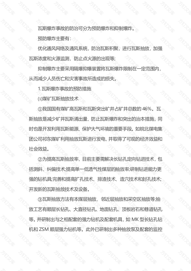 瓦斯爆炸事故的防治可分为预防爆炸和抑制爆炸预防爆炸主要有优化通风网络及通风系统,防治瓦斯积聚,进行瓦斯抽放,加强斯浓度和火源监测,防止点火源的出现等,抑制爆炸主要采用隔爆抑爆装置将瓦斯爆炸限制在一定范围内,从而减少人员伤亡和灾害事故所造成的损失。1.瓦斯爆炸事故的预防措施(1)煤矿瓦斯抽放技术①我国国有煤矿高瓦斯和瓦斯突出矿井占矿井总数的46%。瓦斯抽放是减少矿井瓦斯涌出量、防止瓦斯爆炸和突出的治本措施,同时也是开发利用瓦斯能源、保护大气环境的重要手段。如皖北煤电集团公司祁东煤矿利用抽放瓦斯进行发电,并取得了可观的经济效益和社会效益。②为提高瓦斯抽放率,目前主要需解决长钻孔定向钻进技术,包括测斜、纠偏技术提高单一低透气性煤层的抽放率研制钻进能力更强的钻机具完善和提高扩孔技术、排渣技术、造穴技术和封孔技术;开发新的瓦斯抽放技术及设备。③瓦斯抽放方法有本煤层抽放、邻近层抽放和采空区抽放等抽放工艺有顺层长钻孔、大直径钻孔、地面钻孔、顶板岩石和巷道钻孔等。并研制出与之相配套的强力钻机及配套机具,如MK型长钻孔钻机和ZSM顺层强力钻机等。此外已研制出多种抽放泵及配套的监控系统和仪表等,大大提高了瓦斯抽放量和抽放率,使安全环境得到进步改善。④利用多分支羽状适用技术,解决低渗煤层瓦斯治理问题,以提高抽采率。⑤煤矿瓦斯治理也应该与煤层气产业化紧密结合起来。(2)矿井瓦斯浓度及火源监测技术矿井瓦斯浓度及火源的实时自动监测对于防止瓦斯爆炸非常重要,当发现瓦斯异常或有火源产生,立即采取措施可防止爆炸事故的发生。我国目前开发了KJ90、K92、K94、K)95、KU73、KJ66等型号的矿井安全监控系统,以及各类检测传感器、报警仪和断电仪。已有多个矿井安装了矿井安全综合监控系统,并具有如下功能:2矿井环境和工况参数实时监控,②主要通风机在线监测;:3巷道火灾实时监测4矿井瓦斯抽放实时监测:5冲击地压实时监测:6煤与瓦斯突出实时监测;7煤层自然发火实时监测:万文8瓦斯爆炸或燃烧实时监测⑨矿井电网监测等多种功能。监控系统的安装极大地提高了煤的安全管理自动化水平,防止了许多事故的发生。(3)井下火源防治万文对煤矿井下的爆破火花、电气火花、摩擦撞击火花、静电火花煤炭自燃等火源都有一些相应的防治措施,除炸药安全性检验、电器防爆检验、摩擦火花检验外、还需防止火源与瓦斯积聚在同时同地点出现,如放炮时检测瓦斯浓度,采用风电闭锁、瓦斯电闭锁等措施。另外加强明火的管理,严格用火制度,消除引爆瓦斯的火源。(4)优化通风网络及通风系统合理可靠的通风系统是防止瓦斯事故和控制灾害扩大的重要措施,为此,瓦斯防治工程与采掘工程,必须同时设计,超前施工,同时投入使用。2隔爆措施矿井隔爆抑爆装置是控制瓦斯爆炸的最后一道屏障,当瓦斯爆炸发生后,依靠预先设置的装置可以阻止爆炸的传播,限火焰的传播范围,主要有被动式隔爆棚和自动抑爆装置,①被动式隔爆棚。隔爆岩粉棚、隔爆水槽棚胼和隔爆水袋棚因成本低、安装方便,因而得到了广泛的使用,其中隔爆水袋棚的使用最为广泛。目前研制的XGS型和KYG型隔爆棚,具有适应性强,安装拆卸和移动方便的特点。②自动式抑爆装置。使用压力或温度传感器,在爆炸发生时探测爆炸波,及时将预先放置的水、岩粉、N2、CO2等喷洒到巷道中从而达到抑制爆炸火焰传播的目的。如ZGB-Y型自动隔爆装置采用高压氮气引射消焰剂,能将爆炸限制在距爆源40-60m之内YBW-1型无电源触发式抑爆装置,适合安装在距爆源20-45m的巷道
