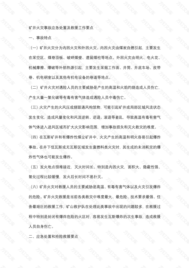 矿井火灾事故应急处置及救援工作要点事故特点(一)矿井火灾分为内因火灾和外因火灾。内因火灾由煤炭自燃引起,主要发生在采空区、煤巷顶板、破碎煤壁、遗留煤柱等地点。外因火灾由明火、电火花、机械摩擦、爆破等外部热源引起,主要发生采掘工作面、井筒、井底车场、皮带巷、机电硐室以及其他有机电设备的巷道等地点。(二)矿井火灾对遇险人员的主要威胁是产生的高温和火焰灼烧造成人员伤亡,产生大量一氧化碳等有毒有害气体造成遇险人员中毒伤亡。(三)火灾产生的火风压或烧毁通风构筑物,可能引起矿井或局部区域风流状态发生变化,造成风量变化和风流逆转、逆退、滚退等紊乱,导致高温有毒有害气体气体进入进风区域而扩大火灾影响范围,增加事故损失和灭火救灾的难度。【四)在瓦斯矿井和有爆炸性煤尘矿井中,火灾产生的高温和明火容易引起爆炸事故。在井下低瓦斯或无瓦斯区域发生富燃料类火灾时,其生成的未消耗完的爆炸性气体也可能发生爆炸。(五)发火地点很难接近,灭火时间长。特别是内因火灾,面积大、隐蔽性强氧化过程比较缓慢,发火后长时间不易扑灭。(六)矿井火灾对救援人员的主要威胁是高温、有毒有害气体以及火灾引发爆炸的危险。矿井火灾救援是当前各类救灾中难度最大、最危险、技术要求最强、任务最艰巨的救援工作,矿山救护队在处理此类事故中出现的问题较多,在救援过程中特别是封闭有爆炸危险的火区时,容易发生瓦斯爆炸的次生事故,造成救援人员自身伤亡。应急处置和抢险救援要点万万现场应急措施1.发现火源时,现场人员应利用附近灭火器材积极扑灭初期火灾,并迅速向调度室报告。在难以控制时应立即佩戴自救器,按照火灾事故的避灾路线,迅速撤出灾区直至地面。2.在撤离受阻时应戴好自救器,选择最近的避难硐室或临时避险设施待救。3带班领导和班组长负责组织灭火、自救互救和撤离工作。采取措施控制事故的危害和危险源,防止事故扩大。(二)矿井应急处置要点1调度室接到事故报告后,必须立即发出警报,通知撤出灾区和可能受威胁区域的人员。在判断受威胁区域时,要充分考虑到矿井外因火灾发展迅速、火烟蔓延速度快的特点,要估计到火势失去控制后可能造成的危害。严格执行抢险救援期间入井、升井制度,安排专人清点升井人数,确认未升井人数。2通知相关单位,报告事故情况。第一时间通知矿山救护队出动救援,通知当地医疗机构进行医疗救护,通知矿井主要负责人、技术负责人及各有关部门相关人员开展救援,通知可能波及的相邻矿井和有关单位,按规定向上级有关部门和领导报告。3要抓住火灾初期容易控制、容易扑灭的有利时机,尽快采取措施灭火和控制火势发展,防止灾情扩大。迅速组织开展救援工作,积极抢救被因遇险人员4保持风机正常运行,维护通风系统稳定,(三)抢险救援技术要点1.了解掌握火灾地点、火灾类型、火源位置、灾区范围、遇险人员数量及分布位通风、瓦斯等有害气体浓度、巷道破坏程度,以及现场救援队伍和救援装备万等情况。根据需要,增调救援队伍、装备和专家等救援资源,2.应迅速派矿山救护队进入灾区侦察灾情,发现遇险人员立即抢救,探明灾区情况,为救援指挥部制定决策方案提供准确信息。救援指挥部根据已掌握的情况、监控系统检测数据和灾区侦察结果,进一步分析判断火源点、燃烧强度、温度及气体浓度分布状况、破坏范围及程度,判断被困人员的生存状况,研究制定救援方案和安全技术措施。3采取风流调控措施,控制火灾烟雾的蔓延,防止火灾扩大,防止引起瓦斯爆炸防止因火风压引起风流逆转造成危害,创造有利的灭火条件,保证救灾人员的安全,并有利于抢救遇险人员。采取反风措施处理进风井简、井底车场及主要进风巷火灾时,必须详细制定和严格实施反风方案和安全措施,反风前,撤出火源进风区人员。4根据现场情况选择直接灭火、隔绝灭火或综合灭火方法。当火源明确、能够接近、火势不大、范围较小、瓦斯浓度在允许范围内时,应采取清除火源、用水浇灭等直接灭火方法,尽快扑灭火灾,防止事故扩大。对于大面积或隐蔽火灾,直接灭火无效或者危及救援人员安全时,应采取封闭火区的隔绝灭火方法或综合灭火方法。封闭具有爆炸危险的火区,应采取注入惰性气体、注浆等措施惰化火区消除爆炸危险,再在安全位置建立密闭墙进行隔绝灭火。5组织恢复通风设施时,遵循“先外后里,先主后次”的原则,由井底开始由外向里逐步恢复,先恢复主要的和容易恢复的通风设施。损坏严重,一时难以恢复的通风设施可用临时设施代替,安全注意事项加强对灾区气体检测分析,防止发生瓦斯、煤尘爆炸造成伤害。必须指定文