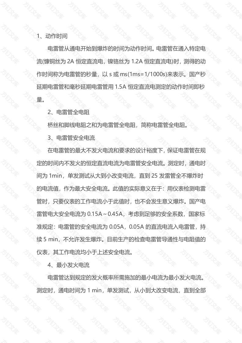 动作时间电雷管从通电开始到爆炸的时间为动作时间。电雷管在通入特定电流(慷铜丝为2A恒定直流电,镍铬丝为1.2A恒定直流电)时,测得的动作时间称为电雷管的秒量,以s或ms(1ms=1/1000s)来表示。国产秒延期电雷管和毫秒延期电雷管用1.5A恒定直流电测定的动作时间即秒02、电雷管全电阻桥丝和脚线电阻之和为电雷管全电阻,简称电雷管全电阻。3、电雷管安全电流在电雷管的最大不发火电流和要求的设计裕度下,保证电雷管在规定的时间内不发火的恒定直流电流为电雷管安全电流。测定时,通电时间为1min,单发测试从大到小改变电流,直到25发雷管全不爆炸时的电流值,作为最大安全电流。此值的实际意义在于:用仪表检测电雷管时,只要仪表的工作电流小于此值时,也不会发生意义爆炸。国产电雷管电大安全电流为0.15A~0.45A,考虑到足够的安全系数,国家标准规定:电雷管的安全电流为0.05A,0.05A的直流电流入电雷管,持续5min,不允许发生爆炸。目前生产的检查电雷管导通性与电阻值的仪表,其工作电流均小于上述安全电流。4、最小发火电流电雷管达到规定的发火概率所需施加的最小电流为最小发火电流。测定时,通电时间为1min,单发测试,从小到大改变电流,直到全部万文25发电雷管全部爆炸时的电流值,作为单个电雷管的最小发火电流。国家标准规定,任何厂家生产的电雷管,其最小发火电流均不超过0.7A。5、串联准爆电流将待试验的雷管分成若干组预先串联起来,每组20发,然后以恒定直流电由小到大依次通入各串联组,连续三次,使组内雷管全部爆炸的最小电流为串联准爆电流。部颁标准规定:20发雷管串联时,慷铜桥丝雷管通过2A恒定直流电,镍铬桥丝雷管通入1.2A恒定直流电,应全部爆炸。6、4ms发火电流根据国家标准(GB7958一87)煤矿用电容式发炮器的规定,电雷管的通电时间固定为4s,调节通入电雷管的直流电流,连续测试20发都能引爆的电流值,称为4s发火电流。此数值对安全工作具有重要意义,因为最先爆炸的炸药,其爆轰波和被爆破的岩块有可能破坏电爆网路,但都发生在4ms之后,而后爆炸的电雷管所需要的电能在4ms内已经供足,断电后并不影响继续引火和传爆,故能满足网路中所有电雷管的供电要求。如果4s后,即使电爆网路被破坏、发生网路志线线头相磁时,不会发生火药或电弧,也就不会引起瓦斯和煤尘爆炸。7、起爆能力即电雷管起爆时所具有的能量,电雷管中起爆药量越多,起爆能力就越强。我国通常只生产6号和8号电雷管,井下用的电雷管都是8号电雷管。现在淮北矿业集团公司使用的是8号刚性点火药头毫秒电雷万爆破地点附近20以内风流中的瓦斯浓度达到1%时,严禁装药爆破。经测定,在高瓦斯矿井炸药爆炸后160ms,瓦斯浓度为0.3%~0.5%,260ms时为0.3%~0.95%,360ms时为0.35%~1.6%,局部地点的瓦斯浓度将更高。秒延期电雷管和半秒延期电雷管各段的间隔时间长达1s和1/2s,当前段炸药爆炸后,瓦斯浓度已经形成,下段电雷管爆炸时,就很容易引燃瓦斯,而且秒或半秒延期电雷管内的延期药在然烧时,就很容易引燃瓦斯,而且秒或半秒延期电雷管内的延期药在燃烧时,要从电雷管的排气孔喷出火焰或高温气体,也成为引燃瓦斯的危险因素,因此秒或半秒延期电雷管不能用于有瓦斯或煤尘爆炸危险的采掘工作面。煤矿使用毫秒延期电雷管则不然,只要最后一段的延期时间不超过130s,就可以在有瓦斯或煤尘爆炸危险的采掘工作面实施电雷管延期爆破。因为130ms仅有360ms的1/3多一点,而其瓦斯的涌出浓度比瓦斯爆炸下限少83%~86%,因而有足够的安全系数,而且煤矿许用毫秒延期电雷管不存在从排气孔中喷出火焰或高温气体的问题。瞬发电雷管与一段毫秒电雷管以及一段秒延期电雷管引火装置结构不同,瞬发电雷管引火装置结构为插入式,没有加强帽,而一段毫秒电雷管和一段秒延期电雷管引火装置均为药头式,且均有加强帽,起爆力较其电阻值也不相同,电引火特性(对电的敏感程度)也不相同,故不