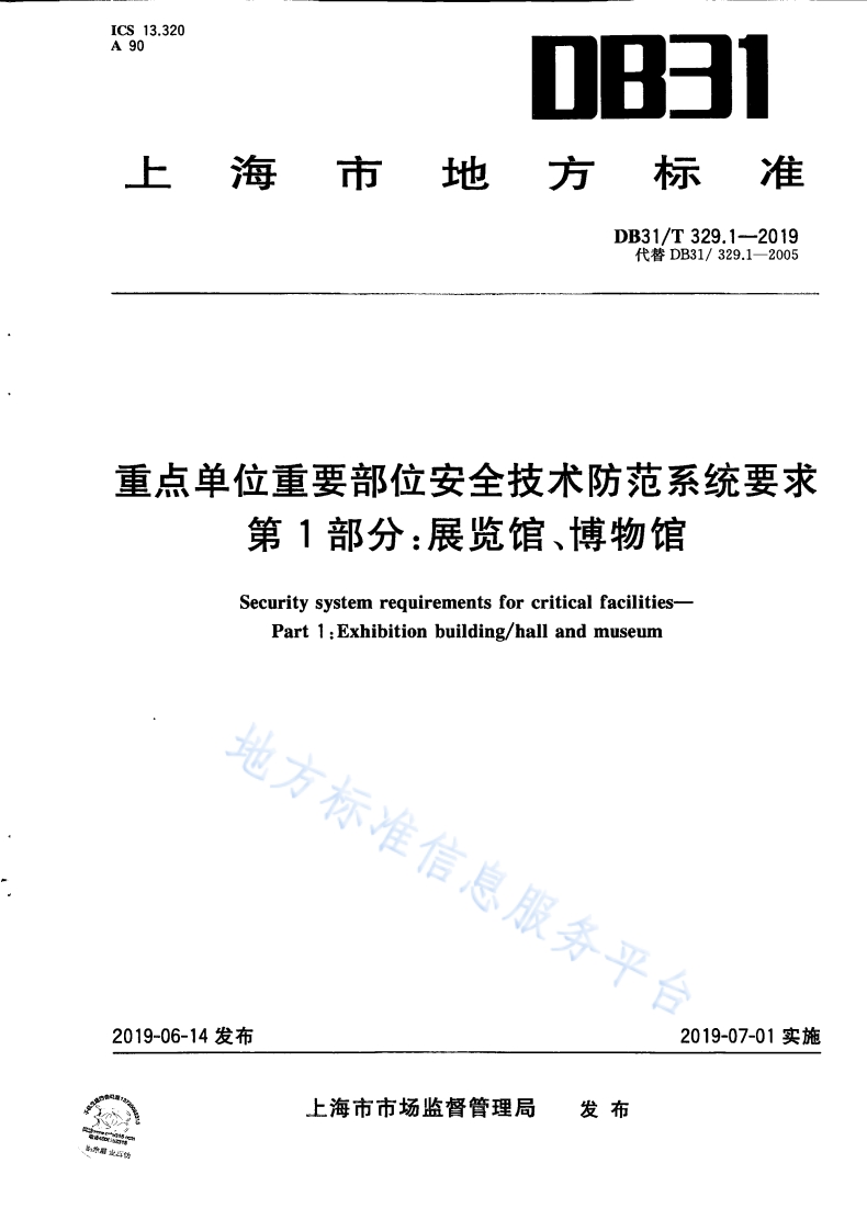 ICS13.320A90上海市地方标准DB31/T329.1-2019代替DB31/329.1一2005重点单位重要部位安全技术防范系统要求第1部分:展览馆、博物馆Security system requirements for critical facilities-Part 1:Exhibition building/hall and museum地方标准信息服务平台2019-06-14发布019-07-01实施上海市市场监督管理局发布地方标准信息服务平台DB31/T329.1-2019目次2规范性引用文件……3术语和定义…4系统设计和施工……4】总体要求342视频安防监控系统…104.3人侵和紧急报警系统…124.4出人口控制系统…134.5声音复核装置……4.6实时电子巡检系统…47专用通信系统………154.8安全检查系统…154,9安防中心控制室…154.10实体防护装置155评审、检验、验收和运营维护要求…1617地方标准信息服务平台I