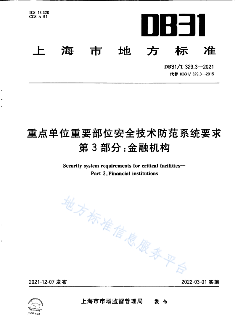 ICS13.320CCS A 91上海市地方标准DB31/T329.3-2021代簪DB31/329.3-2015重点单位重要部位安全技术防范系统要求第3部分:金融机构Security system requirements for critical facilities-Part 3:Financial institutions地方标准信息服务平台2021-12-07发布2022-03-01实施上海市市场监督管理局发布地方标准信息服务平台DB31/T329.3-2021目次1范围12规范性引用文件3术语和定义…4系统设计和施工…4.1总体要求…4.2视频安防监控系统144.3人侵和紧急报警系统……164.4出人口控制系统…174.5安防拾音器/全双工模式对讲装置…181847安全检查系统…4.8安防控制室、设备间、守库室、联网监控中心1949实体防护装置…4.10联网监控中心5评审、检验、验收和运行维护要求……22参考文献…23地方标准信息服务平台