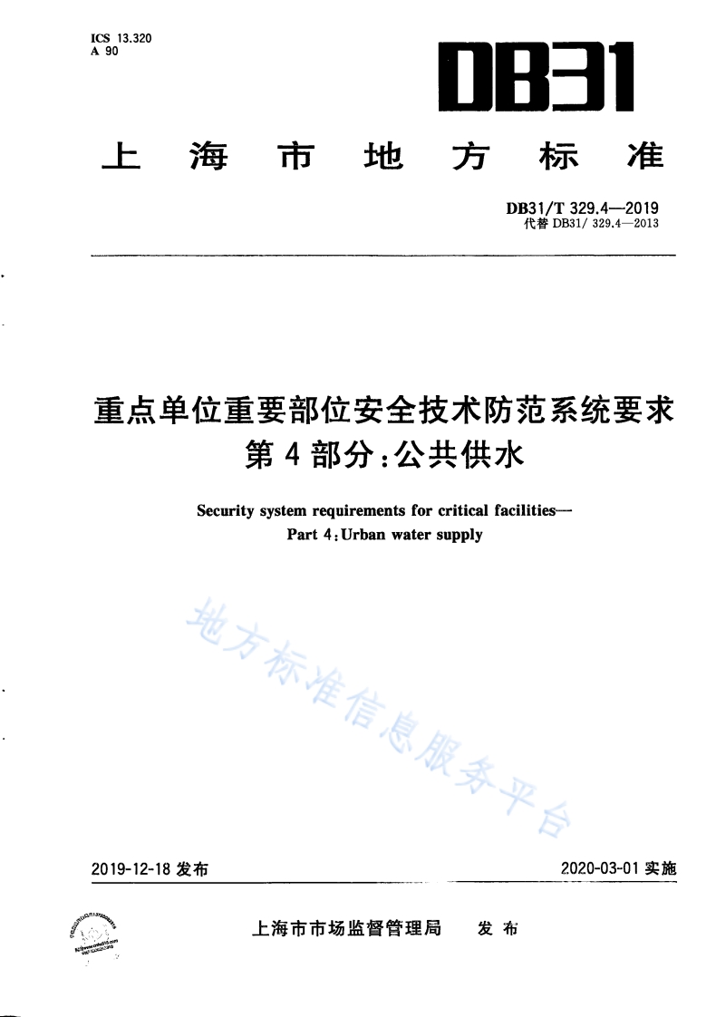 A90上海市地方标准DB31/T329.4一2019代替DB31/329.4一2013重点单位重要部位安全技术防范系统要求第4部分:公共供水Security system requirements for critical facilities-Part 4:Urban water supply地方标准信息服务平台2019-12-18发布2020-03-01实施上海市市场监督管理局发布DB31/T329.4-2019目次前言2规范性引用文件3术语和定义4系统设计和施工…41总体要求4,2视频安防监控系统4,3人侵和紧急报警系统…4.4出人口控制系统4.5实时电子巡检系统…9105评审、检验、验收和运行维护要求1011地方标准信息服务平台DB31/T329.4一2019前言DB31/T329《重点单位重要部位安全技术防范系统要求》分为若干部分,现已发布的有:-—第1部分:展览馆、博物馆:第2部分:危险化学品、放射性同位素集中存放场所:第3部分:金融机构;第4部分:公共供水:第5部分:电力设施:第6部分:中小学、幼儿园、托育机构:第7部分:城市轨道交通:第8部分:旅馆、商务办公楼:第10部分:党政机关,第11部分:医疗机构,第12部分:通信单位;第13部分:枪支弹药生产、经销、存放、射击场所;第14部分:燃气系统,第15部分:公交车站和公交专用停车场库,第16部分:港口、码头;第17部分:监管场所;第18部分:渡轮、游览船,第19部分:寄递单位;第21部分:养老机构:第22部分:军工单位:第24部分:高校。本部分是DB31/T329的第4部分。本部分按照GB/T1.1一2009给出的规则起草。本部分代替DB31/329.4一2013《重点单位重要部位安全技术防范系统要求第4部分:公共供水》。本部分与DB31/329.4-2013相比,除编辑性修改外主要改变如下:一公共供水安全技术防范系统配置表各系统组成增加或提升了配置要求(见表1)。视频安防监控系统按数字视频安防监控系统相关技术要求进行了修改(见4,2)。增加了实时电子巡检系统,替代原电子巡查系统(见4.5,2013年版的5.6)。本部分由上海市公安局、上海市水务局提出并组织实施。本部分由上海市社会公共安全技术防范标准化技术委员会归口。本部分起草单位:上海市公安局治安总队、上海市供水管理处、上海城投(集团)有限公司、上海城投水务(集团)有限公司、上海安全防范报警协会,国家安全防范报警系统产品质量监督检验中心(上海)、上海德梁安全技术咨询服务有限公司。本部分主要起草人:单雪伟、陶焱升、孙亮、顾赵福、顾忠平、沈志华、陈维、林琳、陈军、刘晓新、夏嫣。本部分所代替标准的历次版本发布情况为:—DB31/329.4--2005、DB31/329.4-2013.