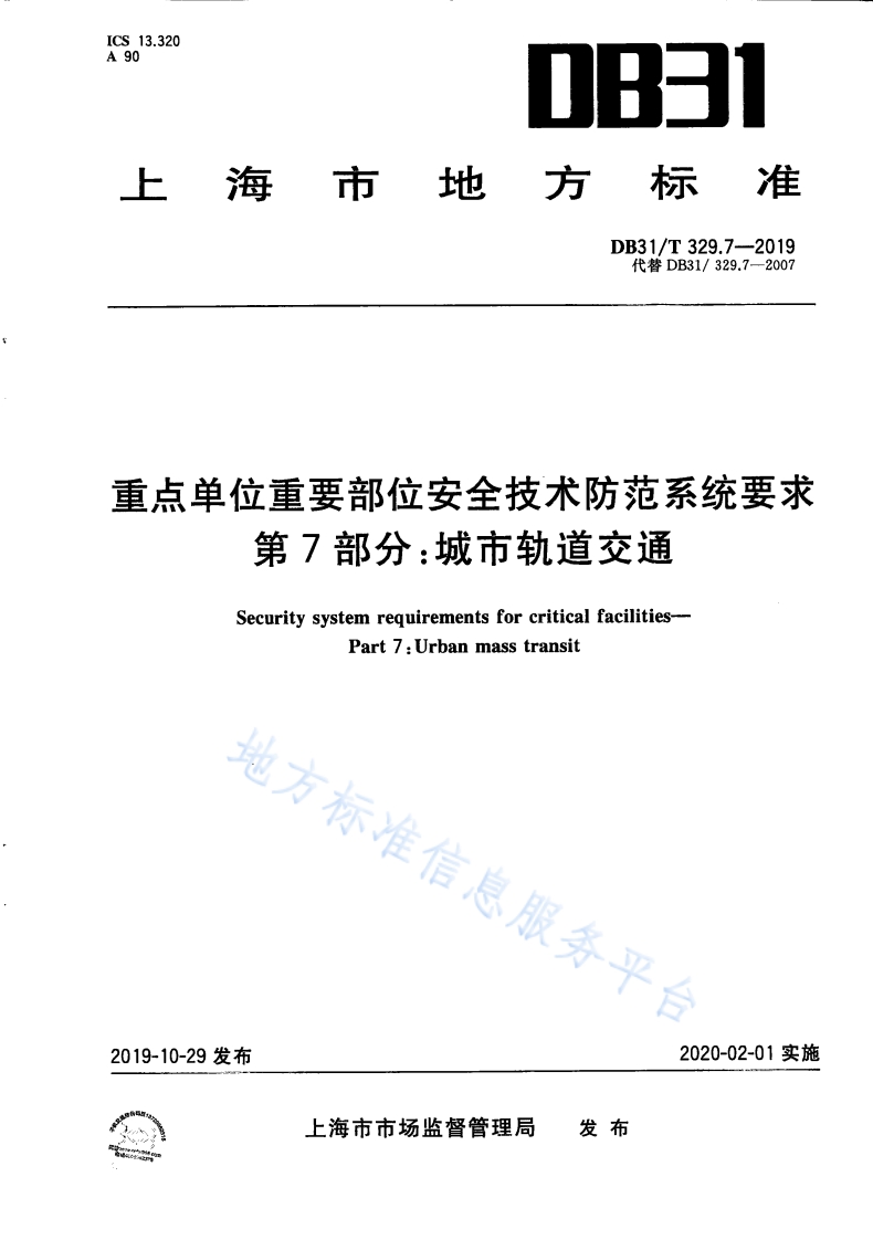 ICS13.320A90上海市地方DB31/T329.7一2019代替DB31/329.7一2007重点单位重要部位安全技术防范系统要求第7部分:城市轨道交通Security system requirements for critical facilities-Part 7:Urban mass transit地方标准信息服务平台2019-10-29发布2020-02-01实施上海市市场监督管理局发布地方标准信息服务平台DB31/T329.7-2019目次前言…2规范性引用文件3术语和定义…24系统设计和施工……341总体要求……4.2视频安防监控系统…4.3人侵和紧急报警系统104.5声音复核装置……4.6实时电子巡检系统104.7电话通信系统…114.8安全检查系统114,9安防中心控制室…114.10实体防护装置…115评审、检验、验收和运行维护要求12参考文献…13地方标准信息服务平台I