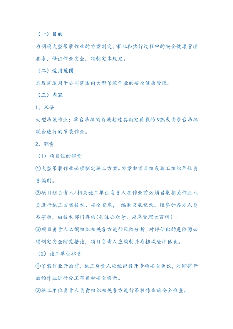 (一)目的为明确大型吊装作业的方案制定、审批和执行过程中的安全健康管理要求,保证作业安全,特制定本规定。(二)适用范围本规定适用于公司范围内大型吊装作业的安全健康管理。(三)内容1、术语大型吊装作业:单台吊机的负载超过其额定荷载的90%或由多台吊机联合进行的吊装作业。2、职责(1)项目组的职责①大型吊装作业必须制定施工方案。方案由项目组或施工组织单位负责编制。②项目组负责人/相关施工单位负责人在作业前必须召集相关作业人员进行施工方案技术、安全交底,编制交底记录,经参加各方人员签字后,由技术部门存档(关注公众号:应急管理大百科)。③项目负责人必须组织相关各方进行风险分析,对评估出的危险源必须制定安全防范措施,项目负责人应编制并存档风险评估表。(2)施工单位职责①吊装作业开始前,施工负责人应组织召开专项安全会议,对即将开始的作业进行分工布置和安全提示。②施工单位负责人负责组织相关各方进行吊装作业前安全检查。③公司综合部和施工单位的相关安全人员负责监督吊装方案和公司各项相关安全健康管理制度的执行情况。④参与吊装作业的项目组人员、相关施工单位负责人必须熟悉并严格执行吊装方案。3、管理内容(1)吊装作业前①施工单位负责根据吊装方案要求,准备充足施工中所使用的施工机具。②项目负责人和施工负责人组织相关人员在作业前对以下各项作出检查:)吊装作业所选择的各台吊机符合吊装方案的要求,证书齐全、有效。b)吊机已进行了全面检查,处于良好状态,安全装置齐全有效。c)吊车司机持有有效的操作证书,了解所使用吊车的性能,熟知吊装作业指挥信号的含义。)每台吊机的荷载符合安全要求(单台吊机作业时,吊机的最大荷载不得超过其安全吊装量的95%:多台吊机联合作业时,各台吊机的最大荷载不宜超过其安全吊装量的80%)(关注公众号:应急管理大百科)。)吊装作业所使用钢丝绳的类型、长度、直径、抗拉强度、破断拉力符合吊装方案中的要求。钢丝绳已进行过检查,没有任何损伤。)吊装作业使用的卸扣的承载能力符合吊装方案要求。(必要时进行NDT探伤检查)。g)拖拉固定使用的钢丝绳、倒链、卷扬机、滑轮组符合方案要求,并已作出检查,结果正常。)吊点在吊装前已进行NDT检验。(若吊点需重复使用,则在吊装后还需进行二次检验))吊装作业指挥人员、吊车司机、司索人员熟悉吊装方案(吊机及索具要求、吊点及重心位置、被吊物重量及尺寸、挂扣方式),并已对是否符合吊装要求做出自检。k)吊装作业指挥人员与吊车司机之间保持通畅的联络方式。)吊装现场的天气状况符合作业要求(风力小于6级、能见度良好)。)吊装作业区域内地面坚实平整,无影响作业安全的障碍物及隐患。)吊装作业现场已设立隔离区,非吊装作业人员远离现场。o)通往吊装现场的道路通畅。p)所有施工吊机已按方案就位,索具按照方案要求固定完毕。③检查完毕后,施工单位安全人员组织施工各有关人员填写《大型起重作业前安全检查表》,并办理《吊装作业许可证》后,方可进行作(2)吊装作业中①吊装指挥人员在确定吊装条件已充分具备后,宣布吊装作业开始。②吊装指挥人员站在能同时看到被吊物及吊车的视线清楚的位置。③所有的被吊物在被吊运时都要根据需要系牵引绳。(系牵引绳会影响安全的情况除外)。牵引绳要有足够的长度以保证作业人员与被吊物间的安全距离(关注公众号:应急管理大百科)。