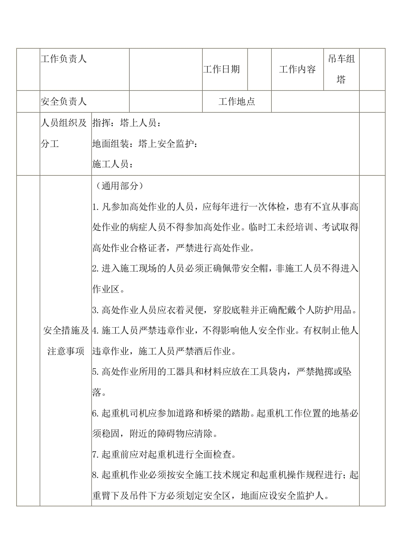 工作负责人吊车组工作日期工作内容塔安全负责人工作地点人员组织及指挥:塔上人员:分工地面组装:塔上安全监护:施工人员:(通用部分)1.凡参加高处作业的人员,应每年进行一次体检,患有不宜从事高处作业的病症人员不得参加高处作业。临时工未经培训、考试取得高处作业合格证者,严禁进行高处作业。2.进入施工现场的人员必须正确佩带安全帽,非施工人员不得进入作业区。3.高处作业人员应衣着灵便,穿胶底鞋并正确配戴个人防护用品。安全措施及4.施工人员严禁违章作业,不得影响他人安全作业。有权制止他人注意事项违章作业,施工人员严禁酒后作业。5.高处作业所用的工器具和材料应放在工具袋内,严禁抛掷或坠落。6.起重机司机应参加道路和桥梁的踏勘。起重机工作位置的地基必须稳固,附近的障碍物应清除。7.起重前应对起重机进行全面检查。8.起重机作业必须按安全施工技术规定和起重机操作规程进行;起重臂下及吊件下方必须划定安全区,地面应设安全监护人。9.分段吊装时,上下段连接后,严禁用旋转起重臂的方法进行位移找正,必须使用控制绳进行调整。10.在电力线附近组塔时,起重机必须接地良好。与带电体的安全距离必须符合安全操作规程。11.塔件离地面约0.1米时应暂停起吊并进行检查,确认正常后方可起吊。12.在遇有雷雨、浓雾、六级以上大风天气严禁进行铁塔组立工作。现场补充部分执行评语安全员年月日说明:1.工作票由施工负责人员填写。2.安全员对工作票进行审核,工作结束后填写执行情况评语并交队长备查。3.一般工作由队长签发;特殊作业和危险较大的工作由项目专工填写,专职安全员审核,项目经理签发。4.在编写安全措施及注意事项时应结合工作的实际情况进行填写。技术数据序号姓名序号姓名序号姓名施工人员签字工作负责人工作日期工作内容吊车组塔安全负责人工作地点人员组织及分指挥:塔上人员:工地面组装:塔上安全监护:施工人员:(通用部分)1.、凡参加高处作业的人员,应每年进行一次体检,患有不宜从事高处作业的病症人员不得参加高处作业。临时工未经培训、考试取得高处作业合格证者,严禁进行高处作业。安2、进入施工现场的人员必须正确佩带安全帽,非施工人员不得进入作业区。全3、高处作业人员应衣着灵便,穿胶底鞋并正确配戴个人防护用品。4、施工人员严禁违章作业,不得影响他人安全作业。有权制止他人违章