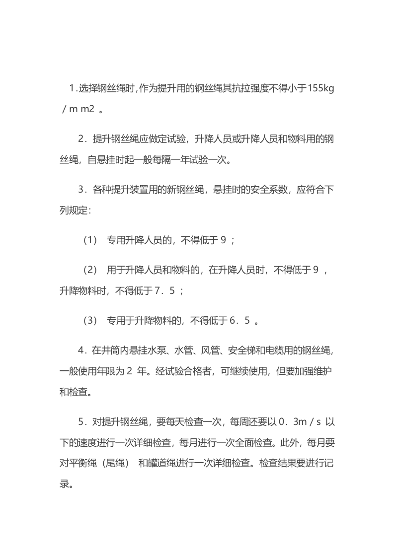 1.选择钢丝绳时,作为提升用的钢丝绳其抗拉强度不得小于155kg/mm2。2.提升钢丝绳应做定试验,升降人员或升降人员和物料用的钢丝绳,自悬挂时起一般每隔一年试验一次。3.各种提升装置用的新钢丝绳,悬挂时的安全系数,应符合下列规定:(1)专用升降人员的,不得低于9;(2)用于升降人员和物料的,在升降人员时,不得低于9,升降物料时,不得低于7.5;(3)专用于升降物料的,不得低于6.5。4.在井筒内悬挂水泵、水管、风管、安全梯和电缆用的钢丝绳,一般使用年限为2年。经试验合格者,可继续使用,但要加强维护和检查。5.对提升钢丝绳,要每天检查一次,每周还要以0.3m/s以下的速度进行一次详细检查,每月进行一次全面检查。此外,每月要对平衡绳(尾绳)和罐道绳进行一次详细检查。检查结果要进行记录。钢丝绳出现下列情况之一时,应更换新绳:(1)提升钢丝绳,在一个捻距内断丝数超过5%(如断丝在端部,允许切去断丝部分继续使用);(2)平衡钢丝绳,在一个捻距内断丝数超过10%:(3)倾斜角在30°以下的斜井提升钢丝绳,在一个捻距内断丝数超过10%,倾角在30以上的提升钢丝绳,按照竖井提升钢丝绳的要求执行;(4)提升钢丝绳,直径比开始使用时缩小10%,或捻距比开始使用时延长0.5%,或外层钢丝直径减小30%时,应更换新绳。6.禁止提升装置使用带有断股、接头或淇他易造成事故缺陷的钢丝绳。7.钢丝绳受到卡罐或突然停罐等猛烈拉力时,应立即停止运转,进行检查。如发现钢丝绳受到损伤,或因剧烈拉动使钢丝绳延长0.5%或直径缩小10%时,必须更换新绳。8.平衡钢丝绳(尾绳)的长度,应能满足罐笼过卷的需要。平衡钢丝绳不得被水淹没,也不许有托绳现象。9.正在使用的钢丝绳,每月至少涂油两次。10.单绳提升,钢丝绳与提升容器之间必须用桃形环连接。钢丝绳穿过桃形孔用绳卡与主绳卡紧,绳卡应不少于5个,其间距为200~300mm。然后再掐一个视察圈。提升容器须用带拉杆的耳环和保险链、或其他类型的连接装置及保险装置,分别连接在桃形环口。安装好的保险链,不准有打结现象。11.必须经常检查防坠器的全部连接部件,并注油润滑。每半年应对使用中的防坠器进行一次清洗和脱钩试验,其下滑长度应不小于100mm,不大于300mm。新安装的或大修后的防坠器,必须进行试验,不合格者不准使用。12.确凿井悬挂吊盘时,吊盘至少要有4点连接在钢丝绳上。井筒深度超过100时,悬挂吊盘用的钢丝绳不得兼作导向绳使用。13.斜井提升时,矿车之间的连接、矿车和钢丝绳挂钩之间的连接,必须使用不能自行脱开的连接装置。倾角超过12°的斜井提升,要加装保险链或保险绳。14.连接装置和其他有关部分的安全系数必须符合下列规定:(1)用于专门升降人员,或升降物料和人员的升降装置的拉杆、保险链和其他类型的保险装置的安全系数不得低于13;