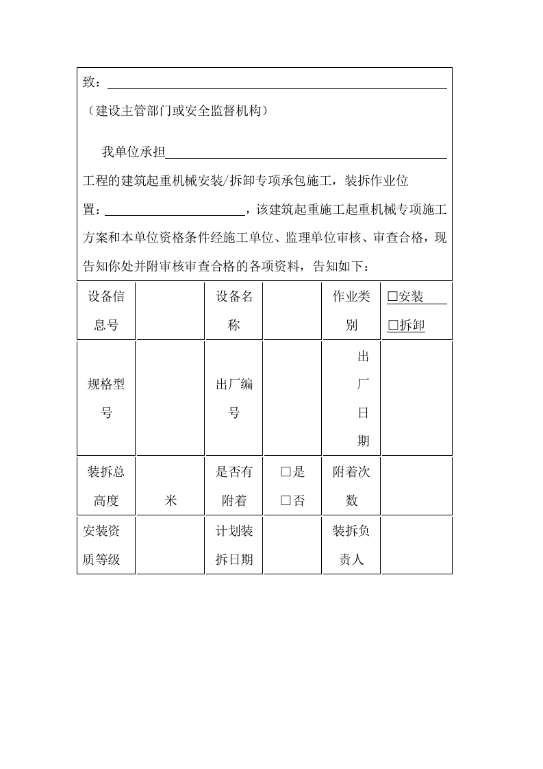 致:(建设主管部门或安全监督机构)我单位承担工程的建筑起重机械安装/拆卸专项承包施工,装拆作业位置:,该建筑起重施工起重机械专项施工方案和本单位资格条件经施工单位、监理单位审核、审查合格,现告知你处并附审核审查合格的各项资料,告知如下:设备信设备名作业类口安装息号称别口拆卸出规格型出厂编厂号号日期装拆总是否有口是附着次高度米附着数安装资计划装装拆负质等级拆日期责人提交的附件资料(为“口”内勾选的资料):一、建筑施工起重机械安装(拆卸)专项方案审核资料1.口建筑施工起重机械安装(拆卸)专项方案报审表2.口建筑施工起重机械安装(拆卸)专项方案审核表(施工总承包单位)3.口建筑施工起重机械安装(拆卸)专项方案审核表(分包单位)4.口建筑施工起重机械安装(拆卸)专项方案(含应急预案)5.口专项方案专家论证报告二、建筑起重机械安装、拆卸工程单位条件审查资料1.口《建筑起重机械安装(拆卸)工程单位条件审核表》2.相关附件材料:1)口安装(拆卸)单位建筑资质证书、安全生产许可证副本(复印件)2)口安装(拆卸)单位配备专业技术人员、机械类或综合类专职安全员名单及资格证书(复印件)3)口安装(拆卸)单位配备装拆人员名单及建筑施工特种作业操作资格证(复印件)4)口辅助起重机械(不含汽车吊)检验有效合格证明及建施工特种作业操作资格证书(复印件)5)口建筑施工起重机械特种设备制造许可证、产品合格证、制造监督检验证明(2014/1/1后制造不提供)等复印件6)口安装(拆卸)单位与施工单位签订的安装(拆卸)专项承包合同(复印件)7)口安装(拆卸)单位与施工总承包单位签订的安全管理协议书(复印件)8)口其他资料:施工单位和监理单位要求的其他有关资料承诺:我单位以上告知情况及提交附件资料均真实有效,无虚假,如失实愿为此承担相应法律责任。装拆单位现场负责人(签字):联系人(签字):安装(拆卸)单位(章)联系电话:年月日