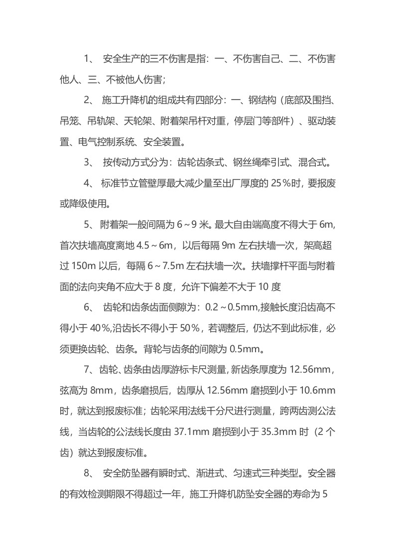 1、安全生产的三不伤害是指:一、不伤害自己、二、不伤害他人、三、不被他人伤害;2、施工升降机的组成共有四暗部分:一、钢结构(底部及围挡、吊笼、吊轨架、天轮架、附着架吊杆对重,停层门等部件)、驱动装置、电气控制系统、安全装置。3、按传动方式分为:齿轮齿条式、钢丝绳牵引式、混合式。4、标准节立管壁厚最大减少量至出厂厚度的25%时,要报废或降级使用。5、附着架一般间隔为6~9米。最大自由端高度不得大于6m,首次扶墙高度离地4.5~6m,以后每隔9m左右扶墙一次,架高超过150m以后,每隔6~7.5m左右扶墙一次。扶墙撑杆平面与附着面的法向夹角不应大于8度,允许下偏差不大于10度6、齿轮和齿条齿面侧隙为:0.2~0.5mm,接触长度沿齿高不得小于40%,沿齿长不得小于50%,若调整后,仍达不到此标准,必须更换齿轮、齿条。背轮与齿条的间隙为0.5mm。7、齿轮、齿条由齿厚游标卡尺测量,新齿条厚度为12.56mm,弦高为8mm,齿条磨损后,齿厚从12.56mm磨损到小于10.6mm时,就达到报废标准;齿轮采用法线干分尺进行测量,跨两齿测公法线,当齿轮的公法线长度由37.1mm磨损到小于35.3mm时(2个齿)就达到报废标准。8、安全防坠器有瞬时式、渐进式、匀速式三种类型。安全器的有效检测期限不得超过一年,施工升降机防坠安全器的寿命为5年,使用中每间隔三个月应进行一次坠落实验。9、防坠实验复位完成后,吊笼必须是先向上运行1m,否则安全器将再次动作。10、在进行安装、拆卸和维修操作的过程中,吊笼最大速度不应大于0.7m/s,安装垂直高度为1%o,垂直度测量应用经纬仪,分别在平行和垂直于吊笼长度的两个方向上进行测量,应分别测量3次取平均值;钢丝绳式为1.5%0.11、司机作业前应重点检查项目:1、各部结构无变形,连接螺栓无松动;2、齿条与齿轮、导向轮与导轨均接合正常;3、各部钢丝绳固定良好,无异常磨损;4、运行范围内无障碍。12、作业后,应将梯笼降到底层,各控制开关拨到零位,切断电源,锁好开关箱,闭锁梯笼门和维护门。作业前应鸣笛示警13、升降机在大雨、大雾、六级及以上大风以及导轨架、电缆等结冰时,必须停止运行,并将梯笼降到底层,切断电源,做好交接班记录。14、司机安全职责之”十字”作业方针:清洁、调整、紧固、润滑、防腐;“四懂”指:一、懂原理、二、懂构造、三、懂性能、四、懂用途:“三会”指:一、会操作、二、会维修、三、会除故障;“两精”一、精心操作、二、精心保养。15、吊笼运行不平稳的原因:①滚轮未调整好;②驱动齿轮磨损超标;③减速器轴弯曲;④齿条损坏或齿条间过度不好;⑤齿条齿轮啮合不良。16、吊笼起、制动时动作异常猛烈原因:1.电机制动器动作不同步;2.驱动板连接部位松动;3.电机制动力矩过大;17、吊笼启动困难,电机发热严重原因:1.电源功率不足,电压降过大;2.制动器制动不正常;3.超载18、高空倾翻坠落的原因:1.导轨架顶端自由高度、导轨架与附壁距离超过出厂规定;2.导轨架安装不牢固;3.导轨架主弦杆磨损、锈蚀超标;4.暴风;5.偏载、超载19、冲顶的原因:1.使用时施工升降机上限位、上极限位功能失效或未安装;2.安装加高时,上限位、上极限位、天轮架未安装,使高度机械郕限位功能失效,降吊笼开出导轨架,高空倾翻坠落。20、施工升降机安装前必须做到:1.熟读使用说明书,清楚施工升降机的工作原理,结构性能,熟悉安装(拆卸)工作过程,知晓各部件的重量、装配关系、吊点位置,具备排除故障的能力,严格按使用说明书有关规定及注意事进行。21、安装技术要求:基础平整度为1%。,用水平仪测量,地脚螺栓中心距最大允许偏差±5mm;基础下地面承载力不小于0.15Mpa,回填时必须夯实,保证强度;基础必须保证排水良好;制作基础时必须同时埋好接地装置。22、地盘上安装三个标准节后,用经纬仪测量导轨架与水平面的垂直度,误差不得超过1.5mm,并用钢垫片将底盘与基础之间垫实。也可以用水平尺检查导轨架顶部四根立柱管端面的水平度,误差不得超过1mm。地脚螺栓用450N.m的力矩紧固。