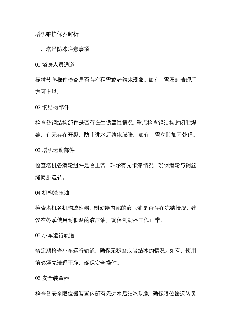 塔机维护保养解析一、塔吊防冻注意事项01塔身人员通道标准节爬梯件检查是否存在积雪或者结冰现象。如有,需及时清理后方可上塔。02钢结构部件检查各钢结构部件是否存在生锈腐蚀情况,重点检查钢结构封闭腔焊缝,有无存在开裂,防止进水后结冰膨胀。如有,需立即加固处理。03塔机运动部件检查塔机各滑轮组件是否正常,轴承有无卡滞情况,确保滑轮与钢丝绳同步运转。04机构液压油检查塔机各机构减速器、制动器内部的液压油是否存在冻结情况,建议在冬季使用耐低温的液压油,确保制动器工作正常。05小车运行轨道需定期检查小车运行轨道,确保无积雪或者结冰的情况。如有,使用前必须先清理干净,确保安全操作。06安全装置器检查各安全限位器装置内部有无进水后结冰现象,确保限位器运转灵敏,动作有效。07排绳装置检查排绳装置表面积雪冰冻情况,表面润滑到位,滑轮是否运行正常。08回转支承检查回转支承冰冻现象,内部润滑到位,并确保旋转顺畅,无卡顿现象。09电器元件检查各电器元件导线接头结冰情况,紧固牢靠,变频器驱动无故障线路无老化现象。10顶升液压系统检查液压油无冻结、乳化现象,接头处无结冰,油缸表面无生锈情况。11平台、走台检查塔机各平台、走台有无积雪、结冰情况。如有,需及时清理,确保人员通行安全。12制动器瓦块检查各机构制动器瓦块是否存在结冰积雪现象。如有,需立即清理确保溜滑。检查刹车间隙是否正常,制动力矩是否满足要求。二、塔吊冬季维保注意事项01传动机构在低于-20°℃环境下工作时,检查减速机润滑油是否被冻结,建议更换耐低温油脂(推荐牌号:CKD220)。检查制动器摩擦副无冻结,开、闭闸灵活可靠;制动轮/盘及摩擦副表面清洁、干燥;在低于-20℃环境下工作时,建议液力推动器的液压油更换为耐低温的液压油(推荐牌号:DB-45)。开式齿轮副(如:回转驱动)无冻结,齿部无可见冰、润滑充分。在低于-20°℃环境下工作时,建议液压系统(包括安全制动器泵站)采用低温液压油(推荐10号航空液压油)。02电控系统检查电控柜内无结冰、凝露现象。若有应做除冰和干燥处理。检查电控启动后,观察变频器、显示屏、控制器、传感器等电气件是否运行正常。检查电缆无老化、破皮现象。电缆接头(包括接插件和端子)处无结冰、凝露现象。检查断路器、接触器、操作台等有活动部件的电气件,确定活动部分无结冰、卡滞现象。03金属结构件