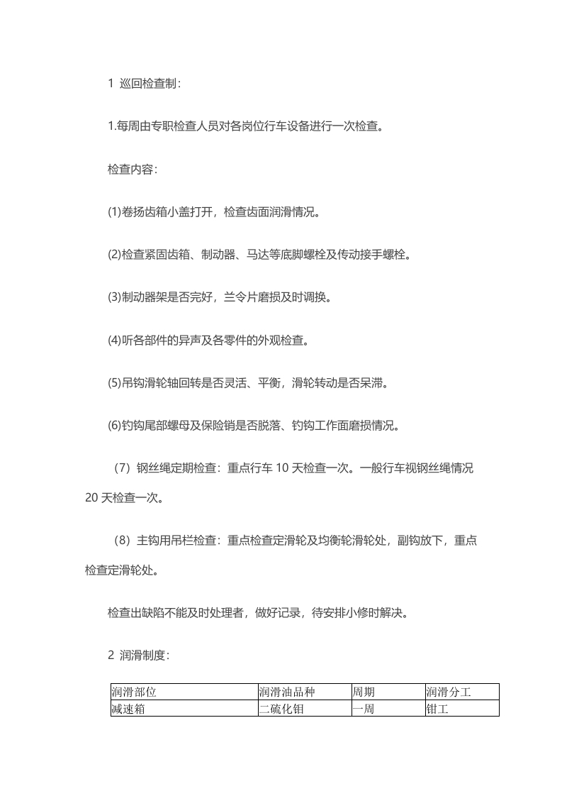 1巡回检查制:1.每周由专职检查人员对各岗位行车设备进行一次检查。检查内容:()卷扬齿箱小盖打开,检查齿面润滑情况。(2)检查紧固齿箱、制动器、马达等底脚螺栓及传动接手螺栓。(3)制动器架是否完好,兰令片磨损及时调换。(4)听各部件的异声及各零件的外观检查。(5)吊钩滑轮轴回转是否灵活、平衡,滑轮转动是否呆滞。(6)钓钩尾部螺母及保险销是否脱落、钓钩工作面磨损情况。(7)钢丝绳定期检查:重点行车10天检查一次。一般行车视钢丝绳情况20天检查一次。(8)主钩用吊栏检查:重点检查定滑轮及均衡轮滑轮处,副钩放下,重点检查定滑轮处。检查出缺陷不能及时处理者,做好记录,待安排小修时解决。2润滑制度:润滑部位润滑油品种周期润滑分工减速箱二硫化钼周钳工高速三月齿接手硫化钼钳工低速年液动轴承二硫化钼年钳工钢丝绳黄油两周驾驶员制动器油泵机油一月驾驶员盖关节每班车轮二硫化钼年钳工3机构的润滑起重机设备润滑情况的好坏直接影响起重机各机构的正常运转。同时,与延长机件的寿命和促进安全生产有密切的关系。因此,使用和维修人员必须经常检查各润滑点的润滑情况,按时用油枪通过各润滑点的油杯加油(一般不用涂抹法,因油脂不易进到润滑面上)。3.1起重设备各润滑点的分布:1.吊钩滑轮组固定滑轮组(小车架上)3.钢丝绳4.各减速器5.各齿轮联轴器6.各轴承箱(包括车轮组)7.电动机轴承8.制动器各节点和轴栓9.长行程电磁铁(MZS1型)的活塞部分10.电缆导电中滑车的轴承3.2润滑条件与润滑材料起重设备必须采用合适的润滑油脂。定期润滑和及时更换。润滑装置和各润滑点必须保持清洁。表7一1是各机构主要零部件润滑时间的一般规定和推荐用的润滑材料。表7一1序号零部件规则润滑条件润滑材料般1530天一次,根@把润滑脂加温到①钢丝绳麻心脂(Q/SY1152-65)钢丝绳据实际使用中的润滑80℃100℃浸涂至饱和②涂合成石墨钙基润滑脂情况决定为宜②不加热涂抹(SYB1405-65)或其它钢丝绳润滑脂使用初期每季换一次复季用HL30齿轮油(SYB1103-62)2减速器后可根据油的情况半年一年换一次冬季(不低于一20℃)用HL20齿轮油(SYB1103-62)齿轮联3轴器每月一次①可采用以任何元素为基本的润滑脂,但不能混合使用。冬季宜用滚轴承36个月一次①工作温度在1、2号,夏季宜用3、4号②用工-20℃06℃②高于滑轴承酌情业锂基润滑脂(Q/SY1110-65)冬50℃③低于一20℃季用1号,夏季用2号③采用1、6齿盘每大修时加满2号特种润滑脂(Q/SY1119-70)电动机年修或大修①一般电动机②H级绝缘①复合铝基润滑脂(Q/SY1105-667和湿热地带②3号锂基润滑脂注:①表7一1中所列Q/SY系辽宁省营口市润滑石油脂厂厂标代号,SYB系石油部部颁标准代号