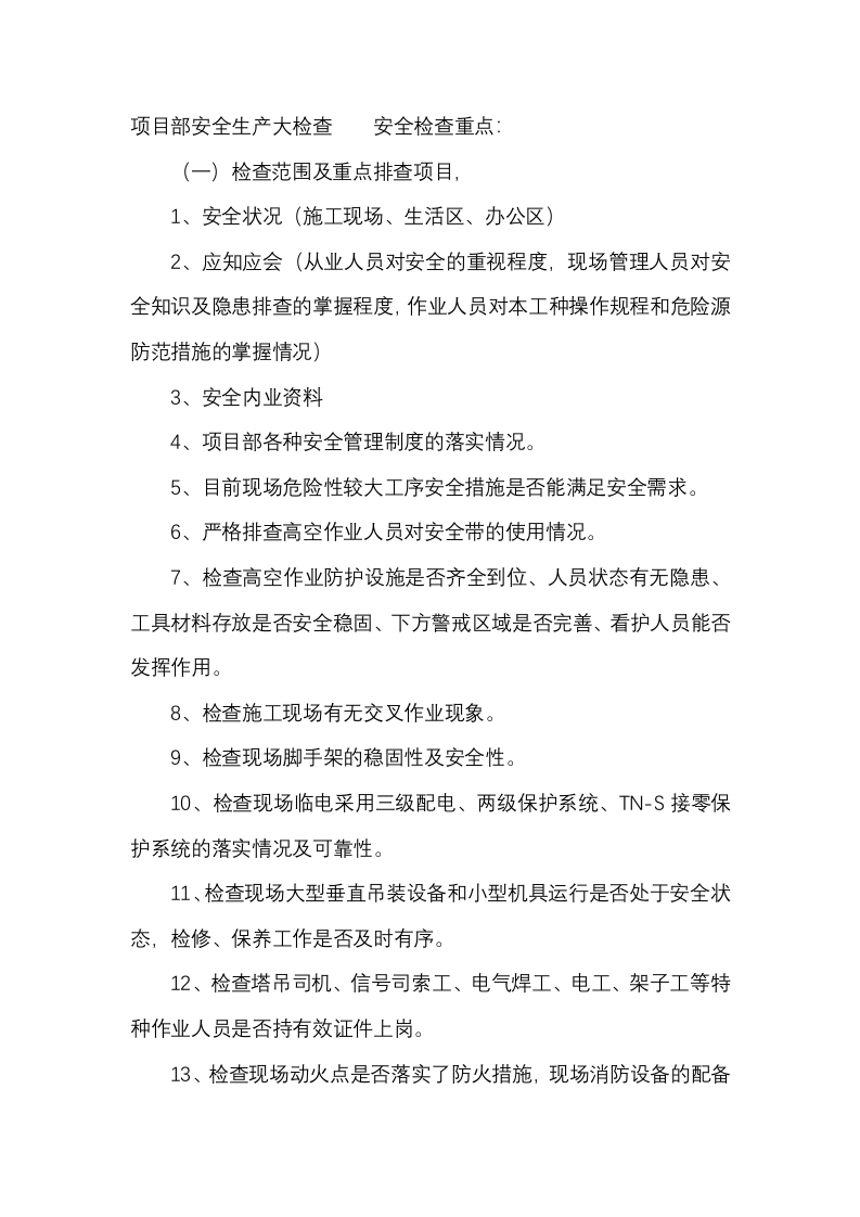 项目部安全生产大检查安全检查重点:(一)检查范围及重点排查项目,1、安全状况(施工现场、生活区、办公区)2、应知应会(从业人员对安全的重视程度,现场管理人员对安全知识及隐患排查的掌握程度,作业人员对本工种操作规程和危险源防范措施的掌握情况)3、安全内业资料4、项目部各种安全管理制度的落实情况。5、目前现场危险性较大工序安全措施是否能满足安全需求。6、严格排查高空作业人员对安全带的使用情况。7、检查高空作业防护设施是否齐全到位、人员状态有无隐患、工具材料存放是否安全稳固、下方警戒区域是否完善、看护人员能否发挥作用。8、检查施工现场有无交叉作业现象。9、检查现场脚手架的稳固性及安全性。10、检查现场临电采用三级配电、两级保护系统、TN-S接零保护系统的落实情况及可靠性。11、检查现场大型垂直吊装设备和小型机具运行是否处于安全状态,检修、保养工作是否及时有序。12、检查塔吊司机、信号司索工、电气焊工、电工、架子工等特种作业人员是否持有效证件上岗。13、检查现场动火点是否落实了防火措施,现场消防设备的配备是否合理有效。14、检查管理人员、作业人员是否熟练掌握现场危险源的防范措施。15、自查项目部与班组采购的安全防护用品有无生产许可证、产品合格证等,确保从源头上保证安全。16、根据管生产必须管安全的原则,检查现场管理人员是否能切实履行安全管理职责。(二)各种高空安全设施、孔洞防护情况,1、高空作业部位安全防护设施的可靠性及完好性。2、检查各种预留洞口、伸缩缝、电梯井口、临边防护设施的安全可靠性,并确保其定型化、工具化。3、检查各种防护的日常维护情况。(三)各种脚手架、操作架体情况,1、检查有无搭设方案、计算书、验收表。2、检查各种杆件、扣件、脚手板、防护网质量有无存在缺陷。3、检查各种架体拉接点的设置是否满足规范及现场需求。4、检查各种杆件、扣件设置的位置是否符合规范要求。5、检查脚手板是否满铺、有无探头板现象,检查各种防护网挂设是否齐全完善。6、检查操作架体的稳固性、上口防护是否完善。7、检查各种架体有无超过规定荷载使用的现象。8、检查架体使用过程中的维护工作。(四)施工用电,1、检查现场用线必须使用五芯电缆线、布线有无违反三级配电、两级保护的要求,检查布线必须设置专用的保护零线。2、检查各种闸具设置与设备是否匹配、安全。3、检查各种设备有无违反“一机、一闸、一漏、一箱”的用电原则。4、检查各种箱体、闸具、线路有无损坏、失灵、老化的现象。5、检查现场接线是否存在私拉乱接现象,工人宿舍和潮湿地方是否使用了低压照明系统。6、检查现场保护零线与工作零线是否存在混接的现象。7、检查电工巡视维修记录是否真实。(五)大型垂直运输设备1、检查塔吊的四限位(力矩、重量、超高、回转限位)、两保险(吊钩、卷筒保险)是否处于安全、灵敏、可靠状态;检查塔吊的电气部分是否安全可靠;检查司机对大风等恶劣天气的应变能力;检查其日常维护保养工作是否及时有序。2、检查室外电梯吊笼安全装置是否定期经过试验,确保其安全灵敏;检查各种限位安全连锁装置是否灵敏可靠;检查架体扶墙与结构的连接是否安全可靠、且是否符合规范要求;检查各楼层防护门是否能及时关闭;检查电气部分是否安全可靠;检查司机是否存在违章超载操作的现象;检查日常保养工作是否及时到位。(六)小型机具与气瓶,