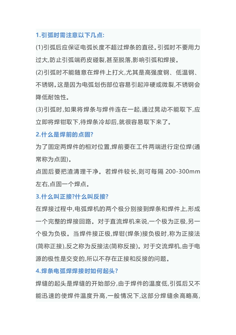 1.引弧时需注意以下几点:(1)引弧后应保证电弧长度不超过焊条的直径。引弧时不要用力过大,防止引弧端药皮碰裂,甚至脱落,影响引弧和焊接。(2)引弧时不能随意在焊件上打火,尤其是高强度钢、低温钢、不锈钢。这是因为电弧划伤部位容易引起淬硬或微裂,不锈钢会降低耐蚀性。(3)引弧时,如果将焊条与焊件连在一起,通过晃动不能取下,应立即将焊钳取下,待焊条冷却后,就很容易取下来了。2.什么是焊前的点固?为了固定两焊件的相对位置,焊前要在工件两端进行定位焊(通常称为点固)。点固后要把渣清理干净。若焊件较长,则可每隔200-300mm左右,点固一个焊点。3.什么叫正接?什么叫反接?在焊接过程中,电弧焊机的两个极分别接到焊条和焊件上,形成一个完整的焊接回路。对于直流焊机来说,一个极为正极,另一个极为负极。当焊件接正极,焊钳(焊条)接负极时,称为正接法(简称正接),反之称为反接法(简称反接)。对于交流焊机,由于电源的极性是交变的,所以不存在正接和反接的问题。4.焊条电弧焊焊接时如何起头?焊缝的起头是焊缝的开始部分,由于焊件的温度低,引弧后又不能迅速的使焊件温度升高,一般情况下,这部分焊缝余高略高,熔深较浅,甚至会出现融合不良和夹渣,因此引弧后应稍微拉长电弧对工件预热,然后压力电弧进行正常焊接。平焊和碱性焊条多采用回焊法,从距离始焊点10毫米引弧,回焊到起始点,逐渐压低电弧,同时焊条做微微摆动,从而达到所需要的焊缝宽度然后进行正常的焊接。5.焊接电弧电压是什么?有什么作用?电弧两端(两电极)之间的电压降称为电弧电压。它包括阴极电压降、阳极电压降和弧柱电压降,在数值上等于三个电压降之和。电弧电压主要取决于电弧长度,电弧长电弧电压大,电弧短电弧电压小。电弧电压大则焊缝熔宽大,电弧电压小则焊缝熔宽小。在焊接过程中,为了获得合适的熔宽和熔深,随着焊接电流的增大,应该相应增大电弧电压。6、焊接速度是什么?有什么作用?单位时间内完成的单道焊缝长度称为焊接速度。焊接的速度取决于焊接电流的大小。焊接电流大,可提高焊接速度,但不要误认为焊接生产效率的高低取决于焊接速度;不是焊接速度越高,焊接生产效率就越高,而是焊接电流大小决定焊接生产效率的高低。焊接电流越大,单位时间内熔化金属量越多,则焊接生产效率越高。在一定焊接电流下,焊接速度的大小影响着焊道厚度。焊接速度大则焊道薄,焊接速度小则焊道厚。7.为什么焊接电弧会偏吹?有什么危害?引起焊接电弧偏吹的因素有以下三种:(1)焊条药皮偏心量过大引起电弧偏吹:焊条电弧焊时,焊条药皮的熔化速度比焊芯熔化速度慢,在焊接过程中焊条药皮形成一个套管,有利于保护电弧。当焊条药皮厚薄不均匀时,厚药皮的熔化速度慢于薄药皮,则在焊接过程中的药皮套管长度方向出现偏斜,势必引起电弧偏向药皮薄的方向。(2)电弧区域磁场强度不均匀引起的电弧偏吹:由于电弧轴线两侧受到不对称磁场作用力,电弧偏向磁场强度弱的方向。电弧区的一侧有良好导体(如筋板)存在时,则电弧偏向导体一侧。假如连接工件的电缆线接到电弧轴线的左侧,则电弧向右侧偏吹。(3)电弧周围的气流干扰引起电弧偏吹:电弧顺着气流方向偏吹,即从强气流向弱气流方向偏吹。电弧偏吹的结果,破坏了电弧的稳定性,使电弧区保护不良,飞溅严重,可造成气孔、未焊透等焊接缺陷。8、防止电弧偏吹的措施有哪些?防止电弧偏吹的措施有:(1)选择药皮不偏心的焊条,并按规定烘干。(2)采用短弧操作,以增强电弧的“刚度”来抵消电弧偏吹的影响。(3)调整焊条施焊角度,使焊条倾斜角度偏向电弧偏吹的反方向,通过改变施焊倾斜角度来改善电弧偏吹的现象。(4)在焊接有间隙的对接焊缝第一层焊缝时,可在间隙背部加垫板或填焊丝,以防止热对流引起的电弧偏吹。也可采用逆向分段