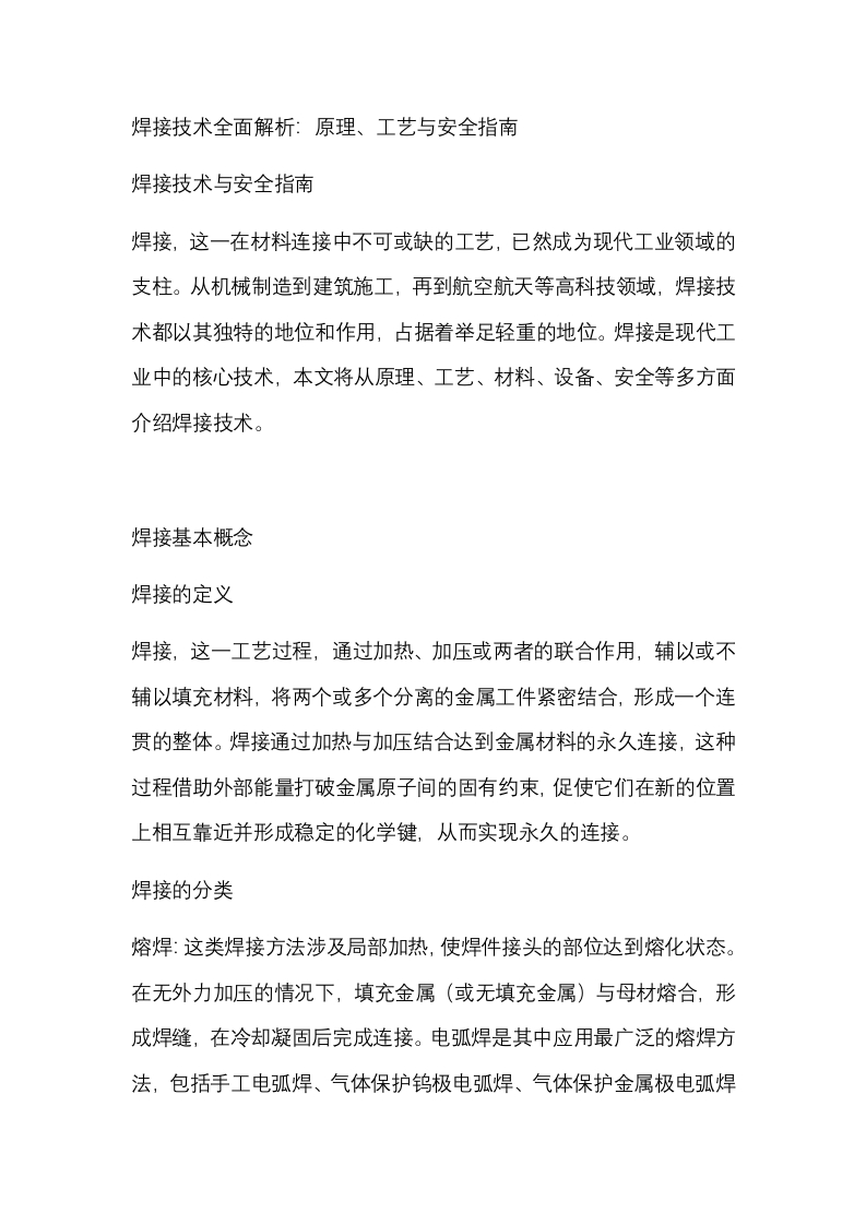 焊接技术全面解析:原理、工艺与安全指南焊接技术与安全指南焊接,这一在材料连接中不可或缺的工艺,已然成为现代工业领域的支柱。从机械制造到建筑施工,再到航空航天等高科技领域,焊接技术都以其独特的地位和作用,占据着举足轻重的地位。焊接是现代工业中的核心技术,本文将从原理、工艺、材料、设备、安全等多方面介绍焊接技术。焊接基本概念焊接的定义焊接,这一工艺过程,通过加热、加压或两者的联合作用,辅以或不辅以填充材料,将两个或多个分离的金属工件紧密结合,形成一个连贯的整体。焊接通过加热与加压结合达到金属材料的永久连接,这种过程借助外部能量打破金属原子间的固有约束,促使它们在新的位置上相互靠近并形成稳定的化学键,从而实现永久的连接。焊接的分类熔焊:这类焊接方法涉及局部加热,使焊件接头的部位达到熔化状态。在无外力加压的情况下,填充金属(或无填充金属)与母材熔合,形成焊缝,在冷却凝固后完成连接。电弧焊是其中应用最广泛的熔焊方法,包括手工电弧焊、气体保护钨极电弧焊、气体保护金属极电弧焊等。此外,还有气焊、激光焊和等离子焊等方法。压焊:在此类焊接过程中,对焊件施加压力(可能加热也可能不加热),使其产生塑性变形。通过原子间的扩散和再结晶过程实现连接。电阻焊、摩擦焊和扩散焊都是典型的压焊方法。钎焊:此方法采用熔点低于母材的金属材料作为钎料。将焊件和钎料加热到高于钎料熔点但低于母材熔点的温度范围内。液态钎料会润湿母材,填充接头间隙,并与母材相互扩散,从而实现连接。软钎焊和硬钎焊是钎焊的两种主要类型。焊接物理与冶金基础焊接热过程在焊接过程中,热源的种类和特性对焊接质量有着至关重要的影响。电弧热作为最常见的热源,其能量高度集中,能够迅速加热焊件局部区域。电阻热则是通过电流在电阻中产生的热量来加热焊件。此外,激光作为高能量密度热源,同样能够实现快速加热和熔化。为了确保焊接质量,焊接过程中的热输入控制和冶金反应是关键。合理控制热输入至关重要。热输入的计算公式为Q=UW,其中Q为热输入,U为电弧电压,1为焊接电流,V为焊接速度。不当的热输入可能导致焊件出现过热、未焊透等质量问题。在焊接过程中,焊件各点的温度随时间和空间变化,形成复杂的温度场。了解温度场的分布有助于预测焊接过程中的热应力、变形以及组织转变。焊接冶金反应焊接冶金反应是焊接过程中不可或缺的一部分。在焊接热源的作用下,焊件和填充金属熔化形成熔池。这个熔池的形成过程伴随着强烈的热对流和物质传输,因此化学成分和温度分布可能不均匀。熔池中的气体在凝固前若未能逸出,则会在焊缝中形成气孔,这可能由于焊接材料受潮、焊件清理不彻底或焊接工艺参数不当所致。同样,熔渣若未被完全清除,则会残留在焊缝中形成夹渣。这些缺陷都会降低焊缝的强度和致密性。此外,焊接过程中还可能产生裂纹。裂纹是一种严重的焊接缺陷,其产生与多种因素有关,如低熔点共晶物的存在、焊接工艺的选择等。为了防止裂纹的产生,需要采取一系列的预防措施。综上所述,了解焊接物理与冶金基础对于确保焊接质量至关重要。通过掌握焊接过程中的热源特性、热输入控制、温度场分布以及冶金反应的原理和机制,可以更好地预防和避免焊接缺陷的产生,从而确保焊缝的强度和性能满足要求。2.焊接材料焊条,作为焊接的必需品,按照药皮性质可分为两大类:酸性焊条和碱性焊条。焊条和焊丝根据其化学成分和用途可分为酸性、碱性、实心、药芯等多种类型。酸性焊条以其药皮中大量的酸性氧化物为特征,其电弧稳定、飞溅小且脱渣容易,对杂质的敏感性也较低。这类焊条