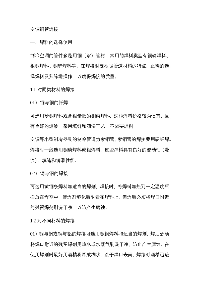 空调铜管焊接一、焊料的选择使用制冷空调的管件多是用铜(紫)管材,常用的焊料类型有铜磷焊料、银铜焊料、铜锌焊料等。在焊接时要根据管道材料的特点,正确的选择焊料及熟练地操作,以确保焊接的质量。1.1对同类材料的焊接01)铜与铜的钎焊可选用磷铜焊料或含银量低的铜磷焊料这种焊料价格较为便宜,且有良好的熔液,采用填缝和润湿工艺,不需要焊料。空调等小型制冷器具的制冷管道为紫铜管,紫铜管的焊接要用硬钎焊。焊接时一般选用铜磷焊料或银焊料,这些焊料具有良好的流动性(漫流)、填缝和润滑性能。02)钢与钢的焊接可选用黄铜条焊料加适当的焊剂,焊接时,将焊料加热到一定温度后插放在焊剂中,使焊剂熔化后附着在焊料上,但焊后必须将焊口附近的残留焊剂刷洗干净,以防产生腐蚀。1.2对不同材料的焊接01)铜与钢或铜与铝的焊接可选用银铜焊料和适当的焊剂,焊后必须将焊口附近的残留焊剂用热水或水蒸气刷洗干净,防止产生腐蚀。在使用焊剂时最好用酒精稀释成糊状,涂于焊口表面,焊接时酒精迅速蒸发而形成平滑薄膜不易流失,同时还可避免水份浸入制冷系统的危险。02)铜与铁的焊接可选用磷铜焊料或黄铜条焊料,但还需使用相应的焊剂,如硼砂、硼酸或硼酸的混合焊剂。二、焊接的具体操作对焊接不同的材料、不同的管径时所需的焊枪大小和火焰温度的高低有所不同,焊接时火焰的大小可通过两个针形阀进行控制调整,火焰的调整是根据氧、乙炔气体体积比例不同可分为炭化焰、中性焰和氧化焰三种。2.1火焰的种类及特点01)炭化焰其特点是氧气与乙炔气的体积比小于1,略缺氧,易将炭粒带入金属而影响焊料流动,冒黑烟,温度约为2700℃左右,可用于对管道的烘烤等。02)中性焰其特点是焰芯的尺寸取决于燃烧气体的成份、耗量和流速,焊炬喷嘴孔直径决定了火焰焰芯的直径,而混合气的流速,则决定了焰芯的长度,中性焰的火焰分3层,)焰芯呈尖锥形,色白而明亮,内焰为蓝白色,外焰由里向外逐渐由淡紫色变为橙色和蓝色,温度约为3000~3500℃左右,氧气与乙炔气的体积之比为1:1.2。制冷空调的管件焊接多使用中性焰。03)氧化焰其特点是焰芯是圆锥形,长度明显地缩短,轮廓也不清晰,颜色暗淡,外焰也缩短了,火焰是蓝色,火焰燃烧时伴有响声,响声大小取决于氧气压力,氧化焰的温度高于中性焰,适用于黄铜的管件焊接。火焰的性质是根据被焊金属种类及其性质来选择的,应注意科学地选调使用。在进行铜管件焊接的时候要注意火焰,火焰的性质是根据被焊金属的种类及其性质来决定的,我们应该合理的选择使用。我们制冷铜管(紫铜)管件焊接一般使用的是中性焰。2.2火焰的调节点燃前先按操作规程分别开启氧气瓶和乙炔气瓶的阀门,使低压氧气表指示在0.2~0.5MPa左右,乙炔气的压力表指示在0.05MPa左右。然后微开焊枪的氧气阀。再微开焊枪上的乙炔气阀,同时,从焊嘴的后面迅速点火。切不可在焊嘴正面点火,以免喷火烧手。点燃后即可调节,两阀的调节就是调节氧气与乙炔气进入焊枪混合气的比例,从而得到不同的火焰。钎料的添加位置在管口上方2mm左右的位置,且钎料的添加位置必须保证在火焰加热的正后方,使烧热的铜管融化焊条;使焊料均匀的流淌、铺展在缝隙表面上。