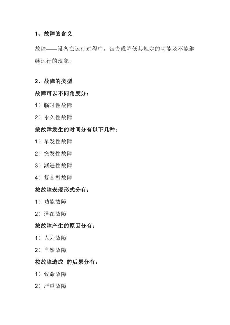 1、故障的含义故障一设备在运行过程中,丧失或降低其规定的功能及不能继续运行的现象。2、故障的类型故障可以不同角度分:1)临时性故障2)永久性故障按故障发生的时间分有以下几种:1)早发性故障2)突发性故障3)渐进性故障4)复合型故障按故障表现形式分有:1)功能故障2)潜在故障按故障产生的原因分有:1)人为故障2)自然故障按故障造成的后果分有:1)致命故障2)严重故障3)一般故障4)轻度故障故障通常采取几种分类法复合并用,如突发性的局部故障;磨损性的危险故障等,由此看出故障的复杂性、严重性和起因等情况。3、故障的特点1)多样性2)层次性3)多因素和相关性4)延时性5)不确定性6)修复性4、故障管理故障管理是设备管理的核心内容之一。其目的在于早期发现故障征兆,及时采取措施进行预防和维修。故障管理的程序和内容包括:1)宣传教育和技术培训相结合。2)制定严格的管理制度和维护保养制度。3)熟悉机械设备结构和工作原理,掌握工作性能。4)配置先进的检查、检测和监测设备,对重要设备和零部件进行实时监测,定期分析,准确掌握设备故障的信息和征兆。5)根据故障现象和信息及征兆,进行认真科学地分析,确定故障原因、类型、采取最佳的维修策略和维修方案,及时维修过程进行记录。提供后期统计和借鉴。6)对常发生或多次重复出现的故障的部位或零件,要重点监测,必要时对其进行系统技术改造。影响故障产生的主要因素1)制造和修理因素对故障的影响a零件材料的选择b零件加工质量C装配质量2)使用因素对故障的影响a工作负荷b工作环境C设备保养和操作技术