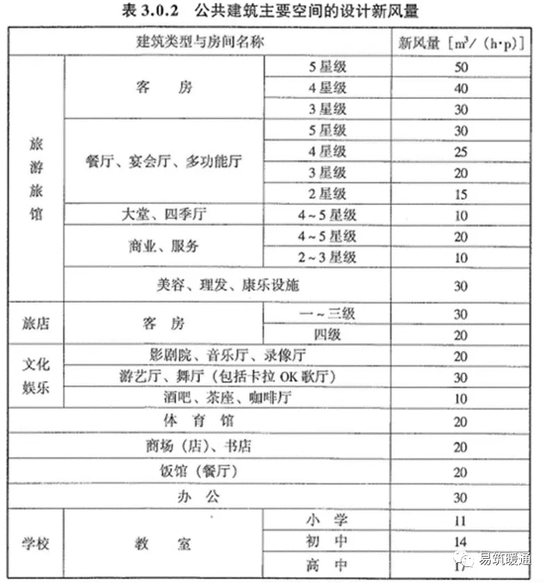 《民用建筑供暖通风与空气调节设计规范》GB50736-2012 3.0.6条民用建筑室内人员所需最小新风量应符合以下规定:1、公共建筑主要房间每人所需最小新风量应符合表3.0.6规定表3.0.6民用建筑主要房间每人所需最小新风量/(m。