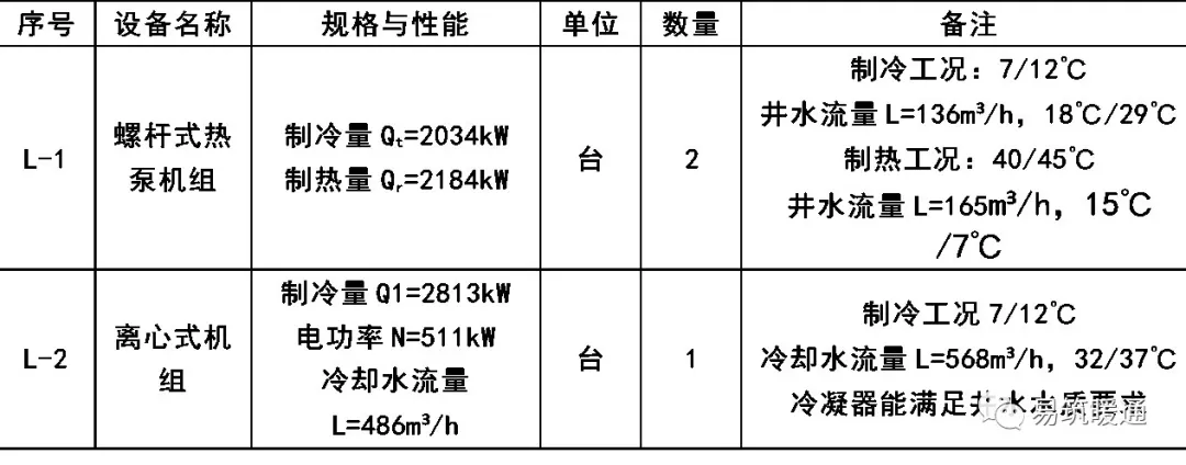 该项目甲方要求选用水源热泵机组,打井部分由甲方负责保证水流量400m³/h,水温17.8℃由于井水只有400m³/h,不能满足全部都采用水源热泵,故选用了2台水源热泵机组,每台螺杆机组的冷负荷为2034kW,热负荷为2184kW,需井水夏天136m³/h,冬天165m³/h,(温度15℃/7℃),1台离心机组冷负荷为2813kW。