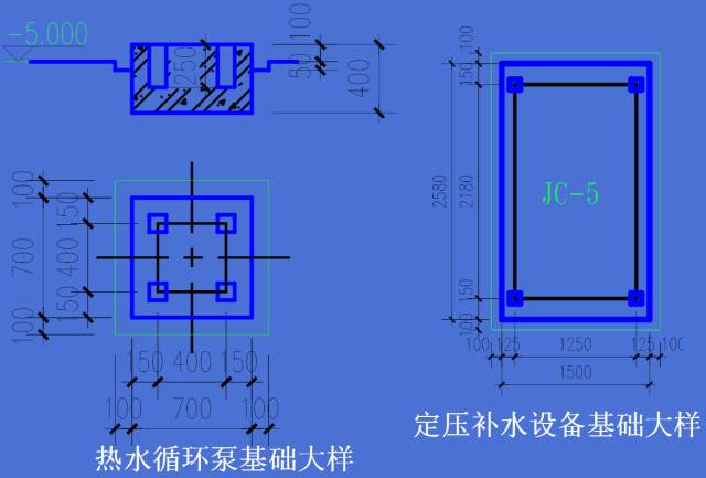 1、水泵基础的平面尺寸,无隔振安装时应较水泵机组底座四周各宽出100~150mm;有隔振安装时应较水泵隔振基座四周各宽出150mm基础顶部标高,无隔振安装时应高出泵房地面完成面100mm以上,有隔振安装时高出泵房地面完成面50mm以上,且不得形成积水。