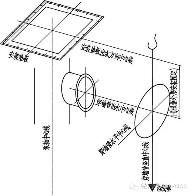 重点检查:穿墙管中心线、安装基础位十字线、泵吐出口中心至泵安装层的高度第二步:吊下伸缩节到预定位置