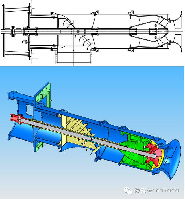 立式斜流泵的结构形式为:垂直向下的喇叭口吸水,水平吐出;泵的下部浸没在水中,采用水润滑导轴承,并有轴保护管将清洁的润滑水与泵输送水隔开;大多数泵做成转子可抽出式,即泵维修拆卸时不必拆动外筒体、外部管路和安装基础,将需要维修的转子部件从泵壳中向上抽出;叶轮和叶轮室之间的间隙值通过上部联轴器处的调整螺母予以调节。
