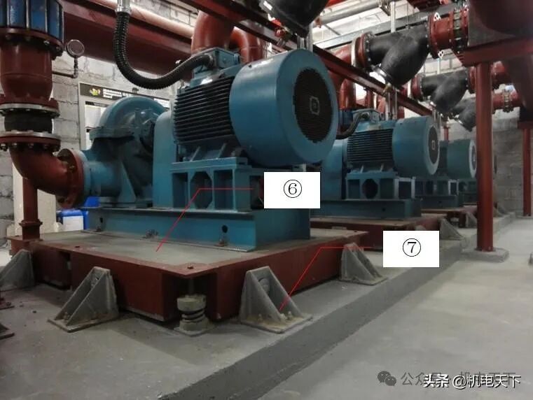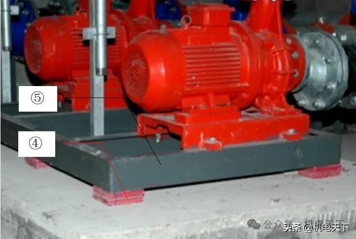 ⑤小型水泵底座下应设槽钢基础,槽钢基础与水泵底座采用螺栓刚性连接。槽钢基础与混凝土基础在橡胶垫处采用膨胀螺栓或地脚螺栓连接。