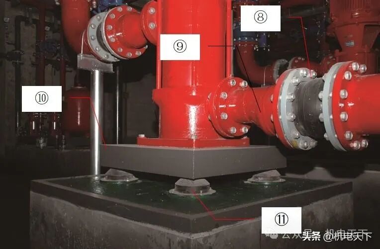 标准参考图标准要求:⑫水泵采用限位式弹簧减震器可不另设减振台座限位装置。地脚螺栓的螺帽外统一套一段PVC管后填充黄油保护。⑬水泵接地应用软线连接在专用接地孔上,不应连接在地脚螺栓上。永久VIP专享