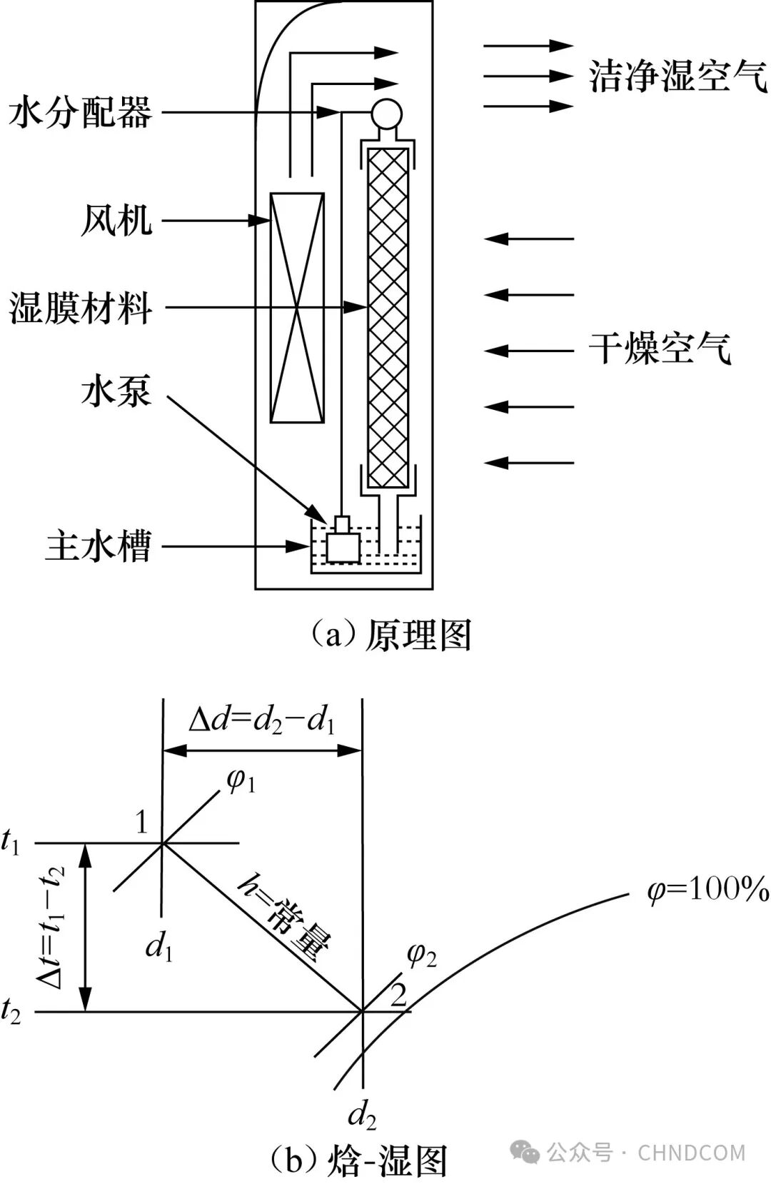 [4]湿膜加湿的过程为等焓加湿,从图1(b)可以看出,将空气先从状态点1加湿至状态点2,水蒸发的热量直接取自机房内循环空气,不增加外部能量,因此该加湿过程有2个作用[5],即加湿且冷却空气,这不仅解决了机。