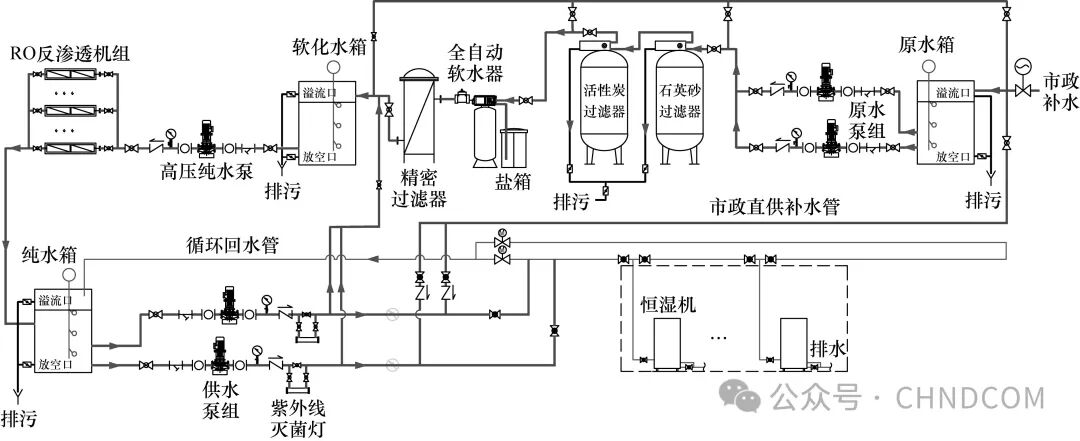 如图2所示的RO纯水装置系统流程图,市政供水先经过原水箱,经软化处理(石英沙、活性炭、树脂)和过滤后,再经过一级RO反渗透设备,最后进入纯水箱,再通过供水泵组(1用1备,自动故障切换功能)向机房设置的加/除湿一体机(恒湿机)供水;设置盐罐辅助软化水,软水设备和纯水设备带自动冲洗和再生恢复功能。