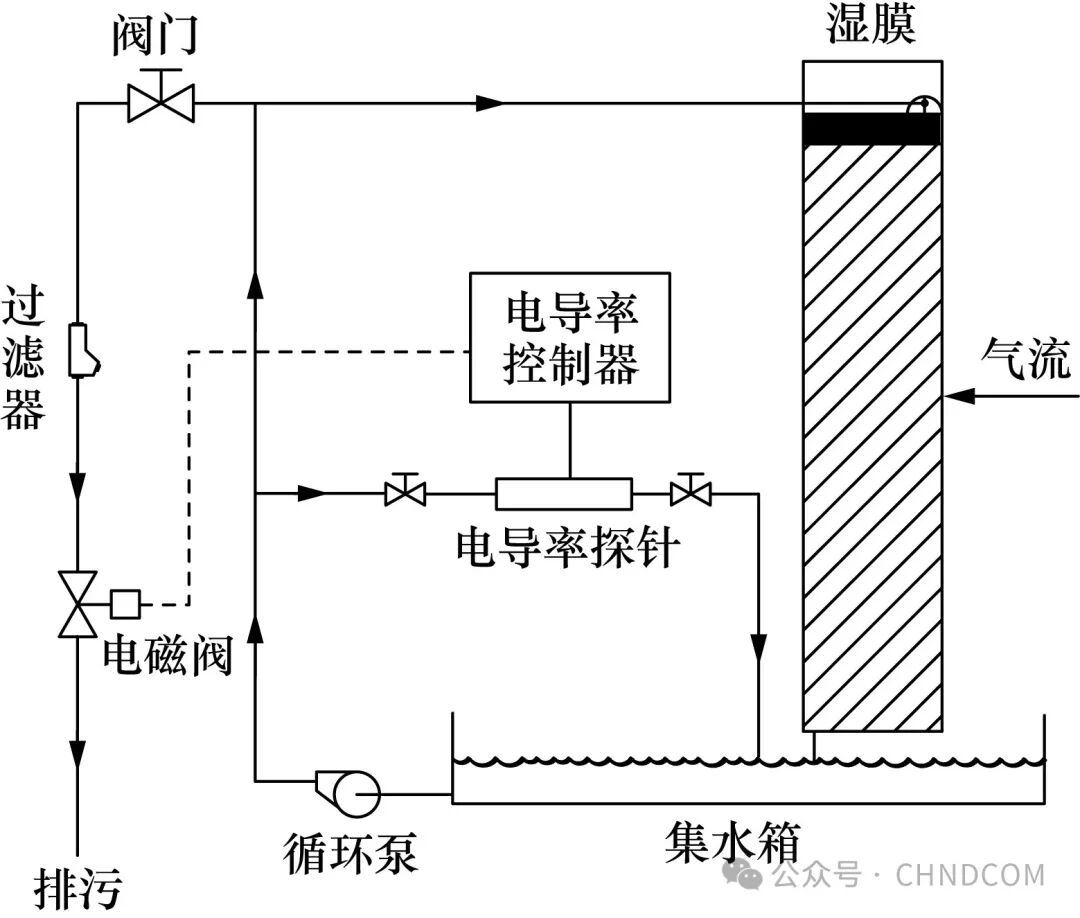 这种连续控制加湿系统排水方法可以有效控制循环水中离子的含量,从而减少离子的结晶析出,达到减少水垢和杂物的沉积