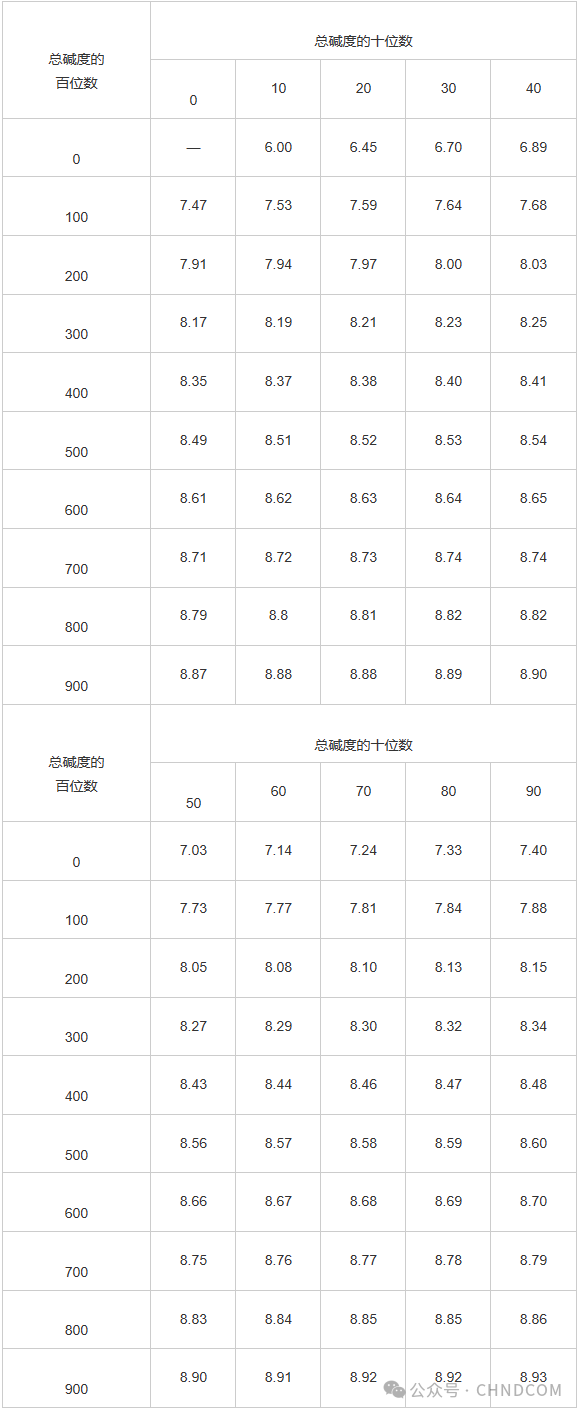 eq-水的总碱度对应关系(见表5)查找得出;也可以根据式(2)计算得出[14]:pHeq=1.465lg(M-水的总碱度)+4.54 (2)表4 pHs计算系数对应表[14,15]