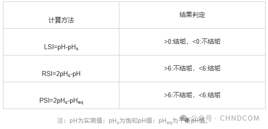 在冷却水系统中运用最多的是Langelier结垢指数(LSI)和Ryznar结垢指数(RSI),由于它们是根据CaCO3的饱和pH值计算的,因此称LSI和RSI分别为饱和指数和稳定指数,计算方法如表3所示