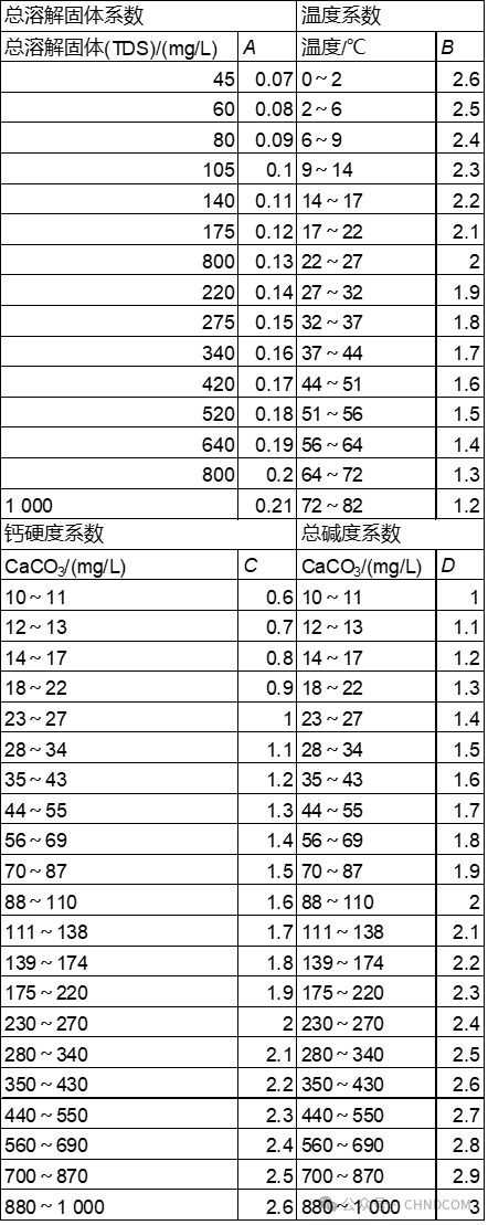[13]:pHs=(9.7+A+B)-(C+D) (1) 式中:A为总溶解固体系数;B为温度系数;C为钙硬度(以CaCO3计)系数;D为总碱度(以CaCO3计)系数(mg/L)根据表4可以查出相应的系数代入式(1)进行计算,即可求得相应电导率下水的pH。