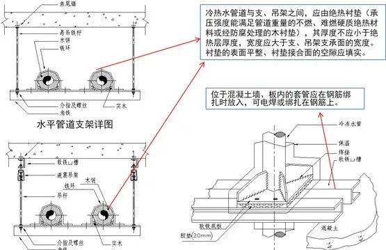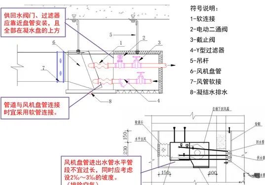 安装要注意事项:A、冷凝水排水管坡度,其坡度宜大于或等于8‰;B、软管连接的长度,不宜大于150mm;C、冷(热)媒水、冷却水系统管道机房内总干管得支、吊架,应采用承重防晃管架;与设备连接的管道管架宜有减振措施;