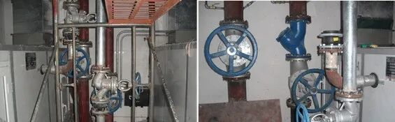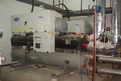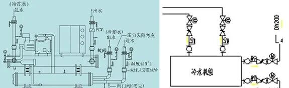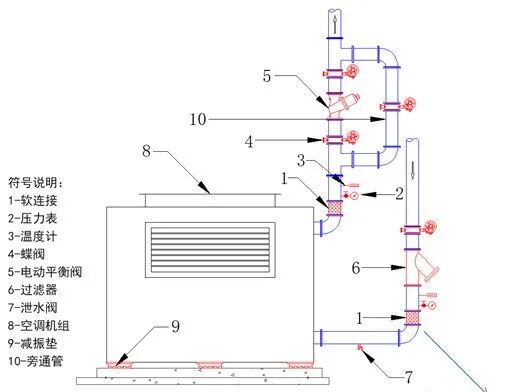 进水管:避震喉、压力表、温度计、蝶阀。回水管:避震喉、压力表、温度计、电动阀(比例积分阀)、蝶阀。3、空调机组的配管连接