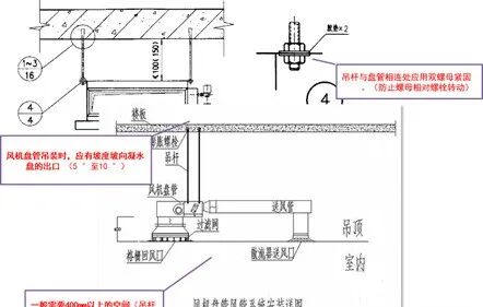 1)吊杆应有足够的强度;2)吊杆螺栓应采取防松措施;3)机组底部应设置隔振垫或采用弹簧减振吊架。2、空调机组的安装